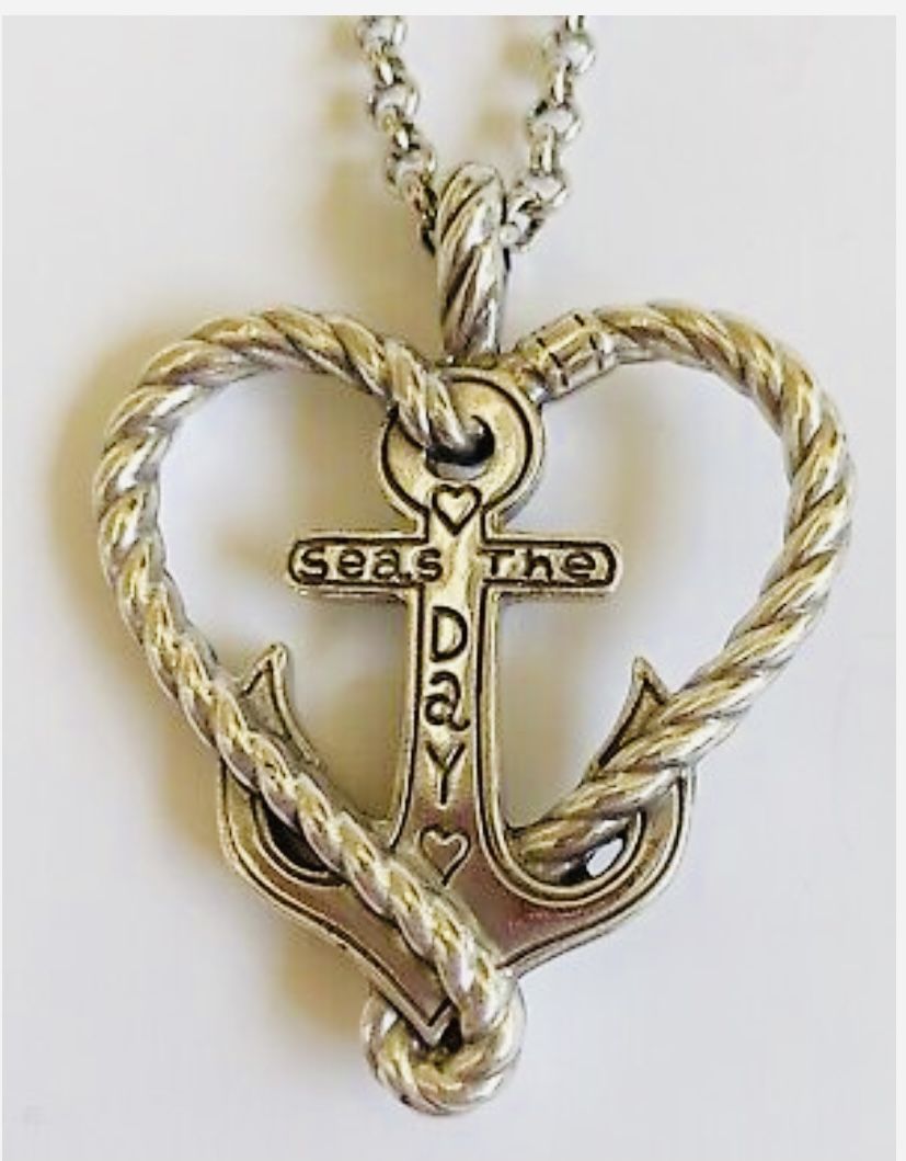 Brighton Anchored in Love Seas the Day Heart Anchor Necklace. In good condition. Brighton Seas the Day Heart Anchor Necklace (Adjustable 16" to 18"). Convertible with "Seas the day" on one side and an anchor design on other side. Pendant has a 2" drop and 1.75" width.