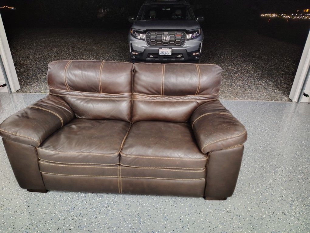 Loveseat 67in wide 37in deep Sofa 90in wide 36in deep Brown leather loveseat and sofa both have cat scratches on them, but no tears.