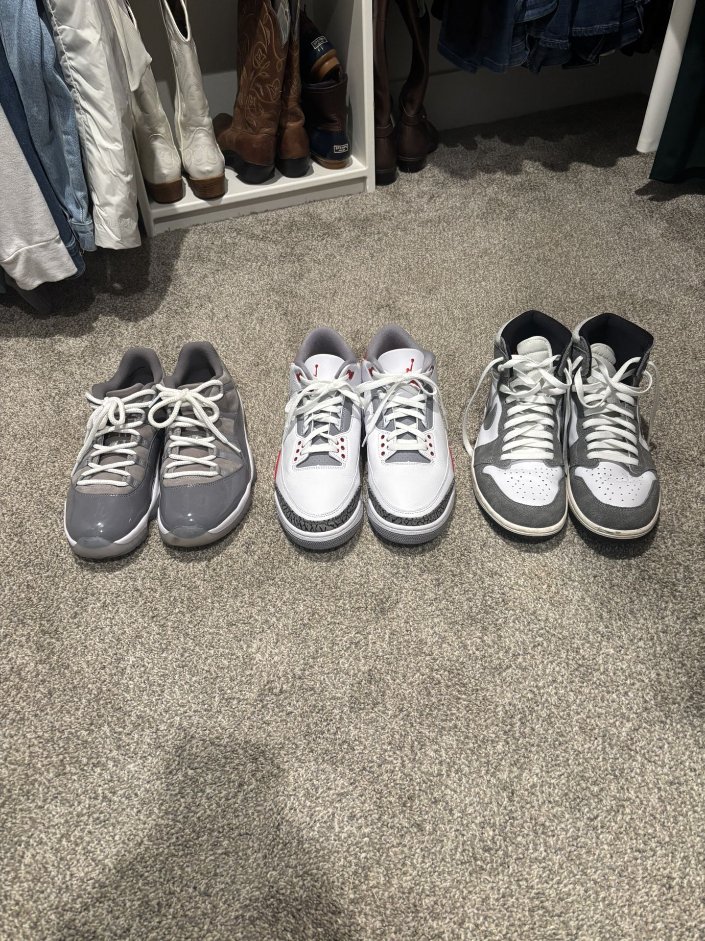 Cool Grey 11 Low sz 10.5 Fire Red 3 sz 11 Washed Black 1 sz 11 Normal wear without boxes All for $200 OBO. Will sell separate as well