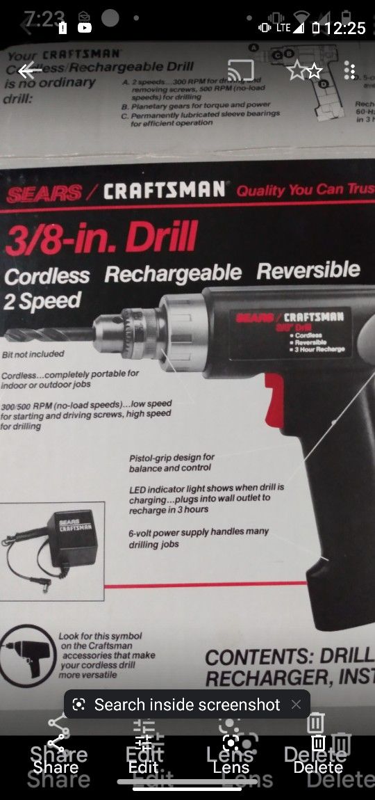 NICE CRAFTSMAN 3/ 8 CORDLESS DRILL 2 SPEED RECHARGEABLE REVERSIBLE EXCELLENT CONDITION !! $25. FIRM !!