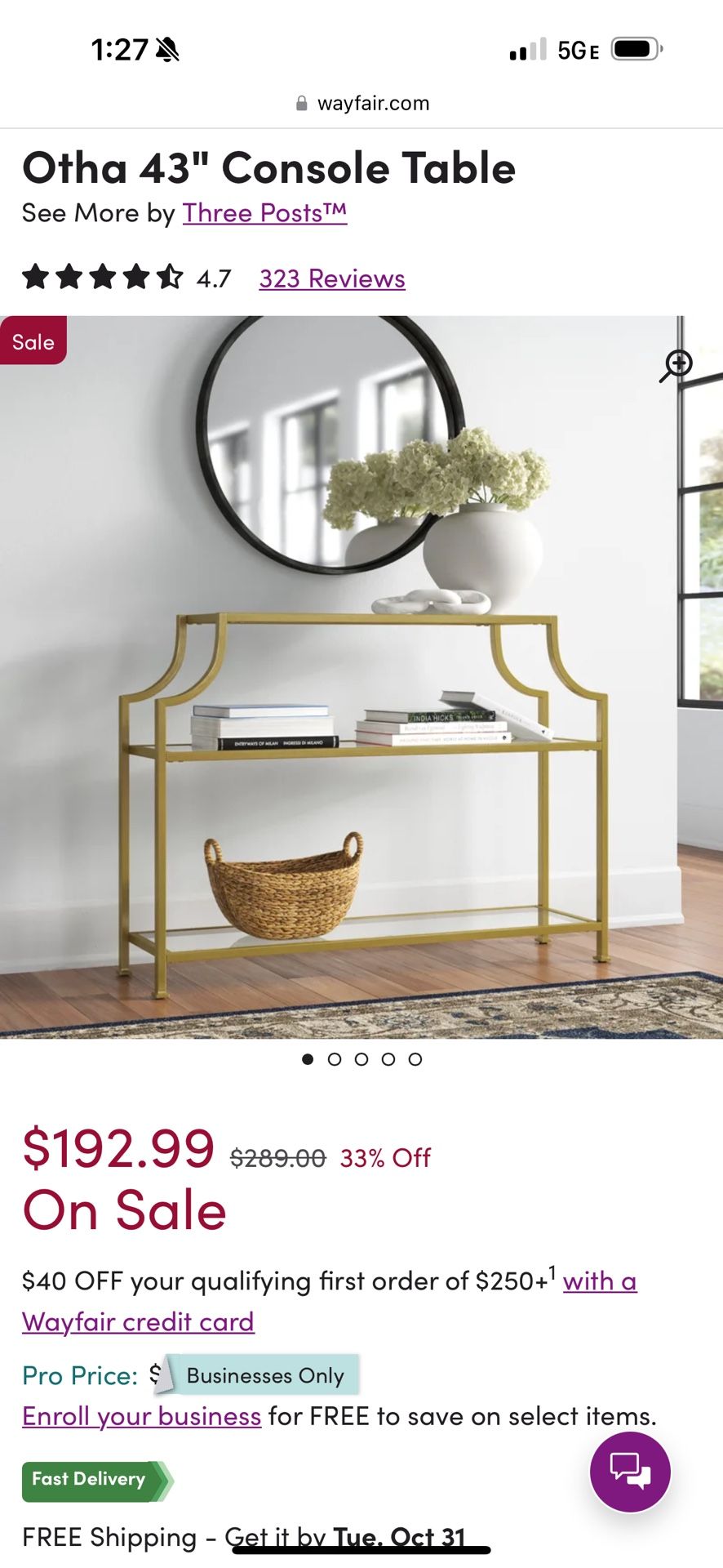43” Console/Entry/Foyer Table with Gold Matte Finish