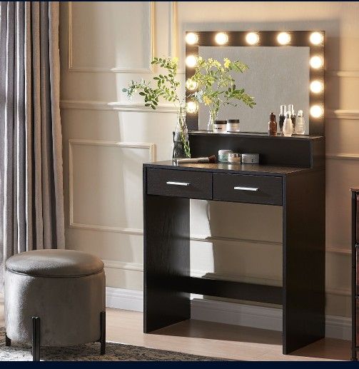 Vanity Desk with Mirror and Lights, Dressing Table with Large Drawer, 2 Level Storage Dresser & 3 Lighting Modes Adjustable Brightness, Suitable for B