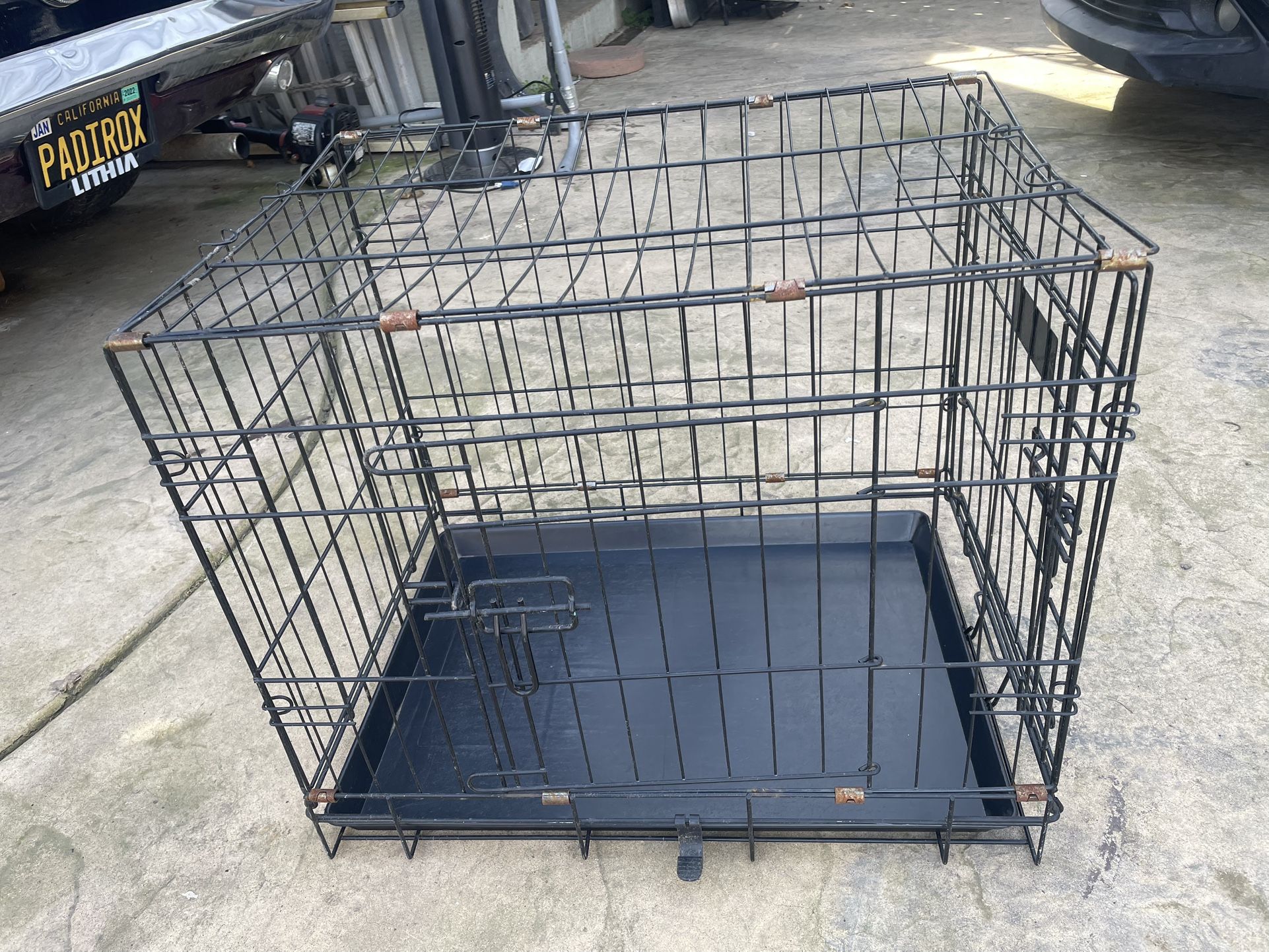 Design: Features doors with double-security latches. • Cleaning: Includes a removable plastic tray at the bottom for easy cleaning. • Mobility: It is collapsible, allowing for easy storage or transport. • Material: Durable metal wire frame.