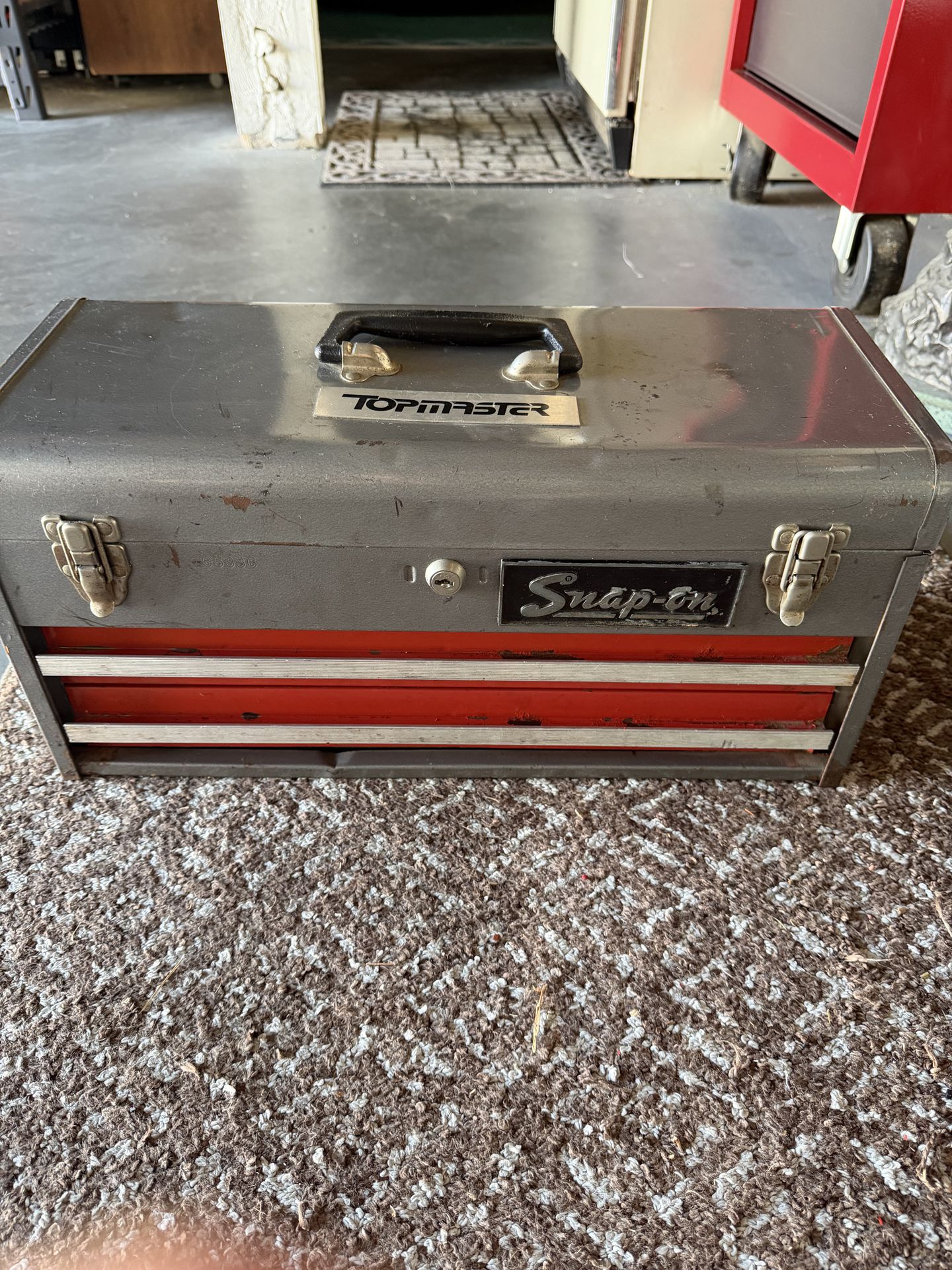 Vintage Snap-On Topmaster 2 drawer tool box 20”w x 9”d x 9”h Model 65336 Very good condition and priced lower than the old beat up ones, moving and selling at very low price.