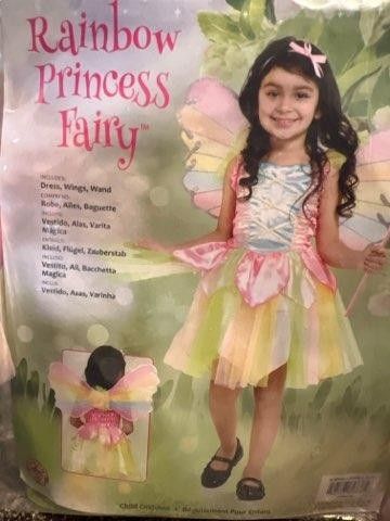 Your child will be shining out magic and color all day long when you dress her up with this Child Rainbow Princess Fairy Costume this year. With this enchanted set, you will receive everything you need to turn your tyke into a gorgeous young fairy who knows a thing or two about pixie dust. Featuring a pretty pastel rainbow dress with matching wings and a floral wand, you're going to love seeing your child in this one. This costume is BRAND NEW in packaging and comes from a smoke free home. Size is X-Small/Small 4-6