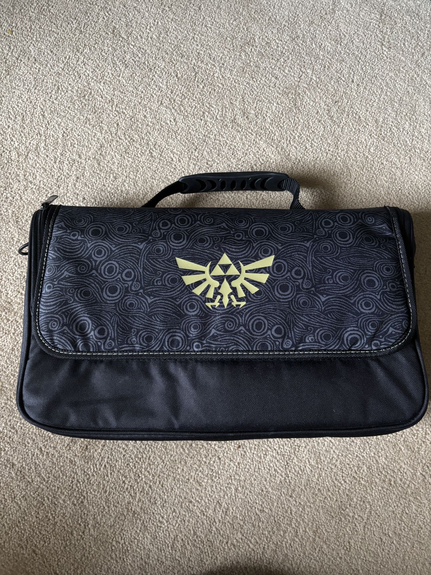 Zelda switch carrier. Has spot to hold switch, games, extra controllers, cords and more. Has the option to remove dividers if you want more space in the bag. Comes with shoulder strap and another storage pocket on the back. Never been used. Very light weight.