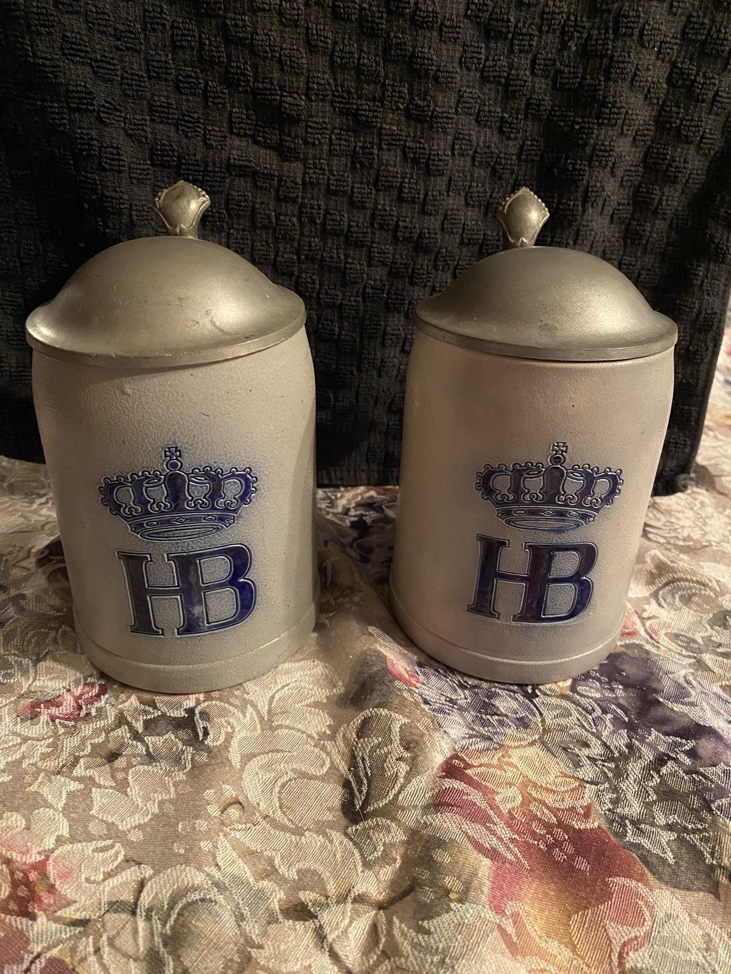 (2) Ceramic HB Hofbrauhaus Munchen steins Made in West Germany Both beer steins are Tankards Pewter lids 5” Tall - .5 L No cracks, chips or repairs Excellent condition