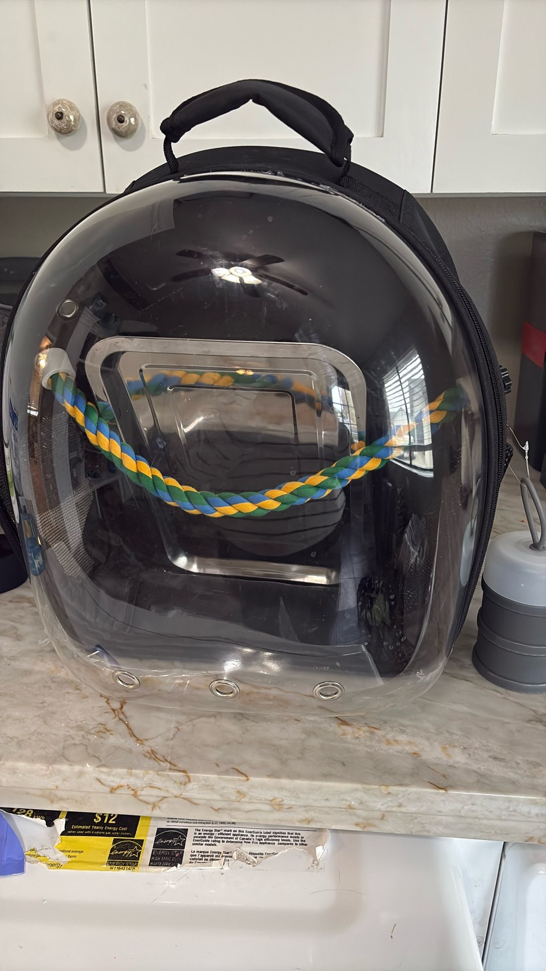 Carrier for a bird, has a rope perch for birds to sit on , used for trips to vet or when cleaning the cage