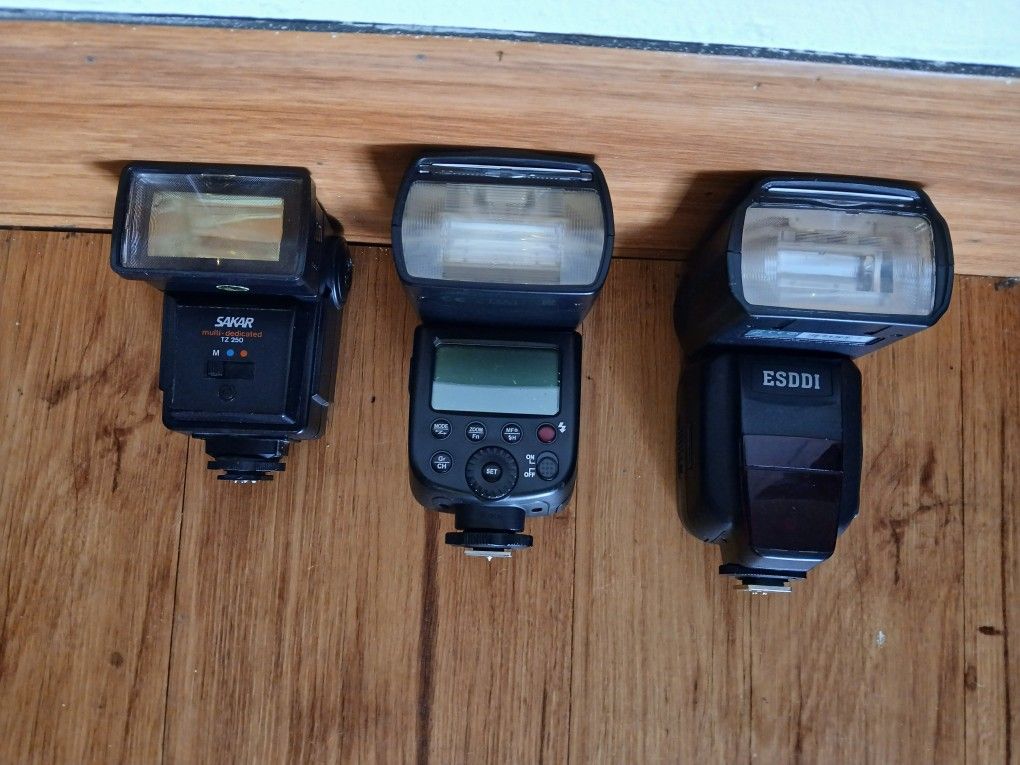 From left to right Sakar tz 250, godox tt600, esddi camera flashes. Each $25