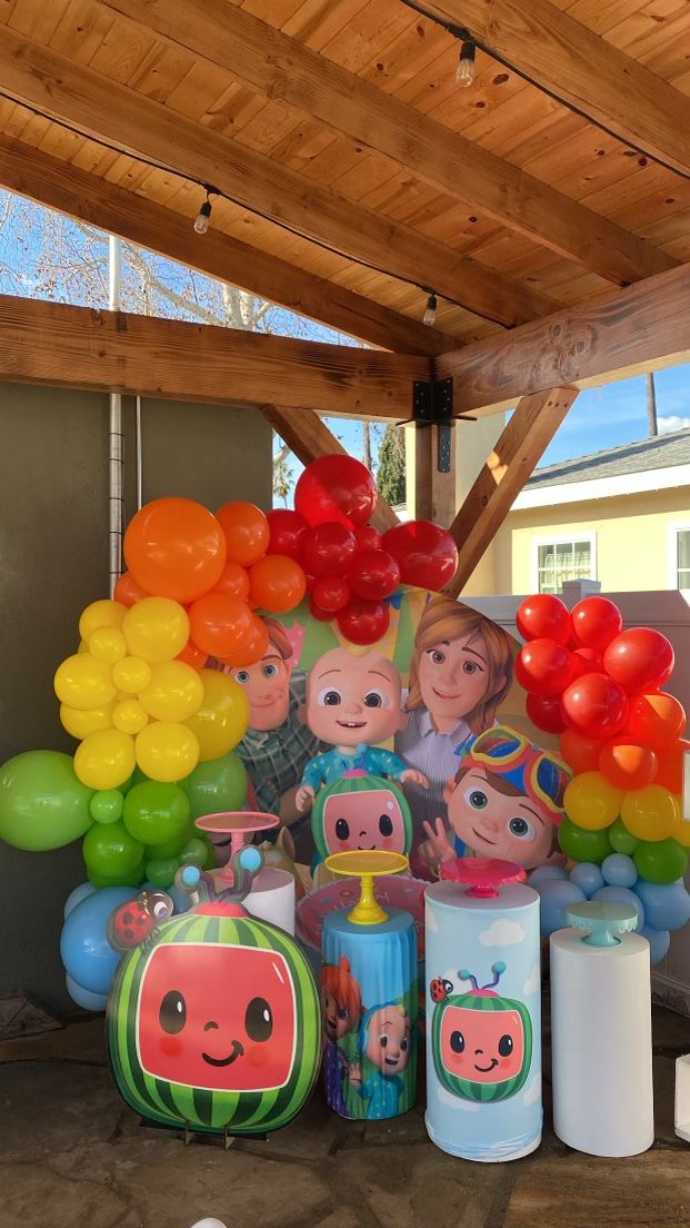 Cocomelon 6ft round spandex slip cover backdrop. Melon face 5ft round spandex slip cover backdrop, 3 Cocomelon cylinder slip covers . Asking $200 must pick up and cash only. (Please note metal hoop backdrop not included nor the Cocomelon character cutouts just the slip covers)