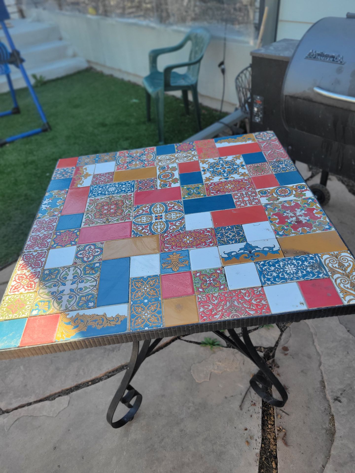 Colorful tile table from Pier One. A couple of loose tiles but all there. Indoor or outdoor use. Beautiful