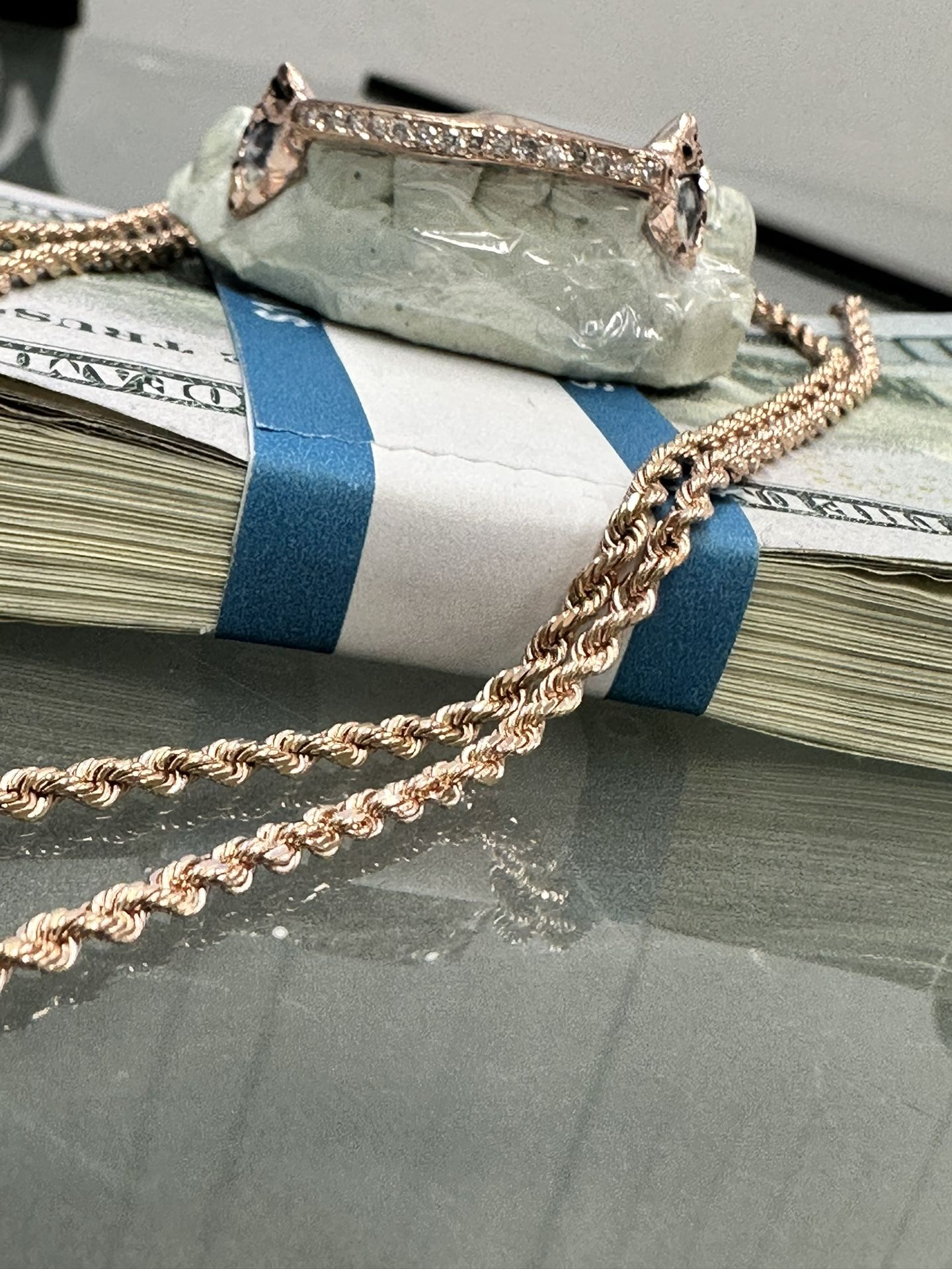 14k Rose Gold Rope Chains $880, $860 14k Custom K9s with the SI Diamond Bar across $1500