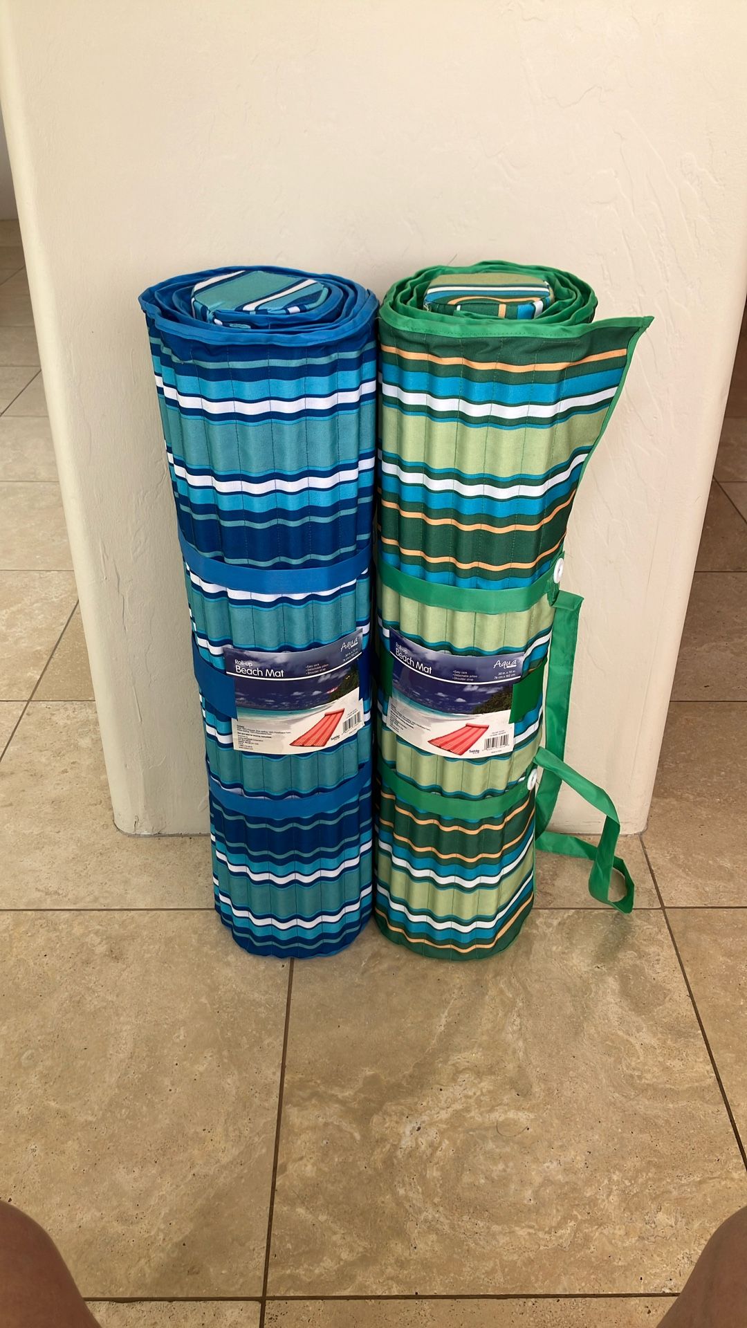Two Aqua rollup beach mats from Costco. They measure 30“ x 72“, one blue and one green. Never used and come from a smoke free head free home.