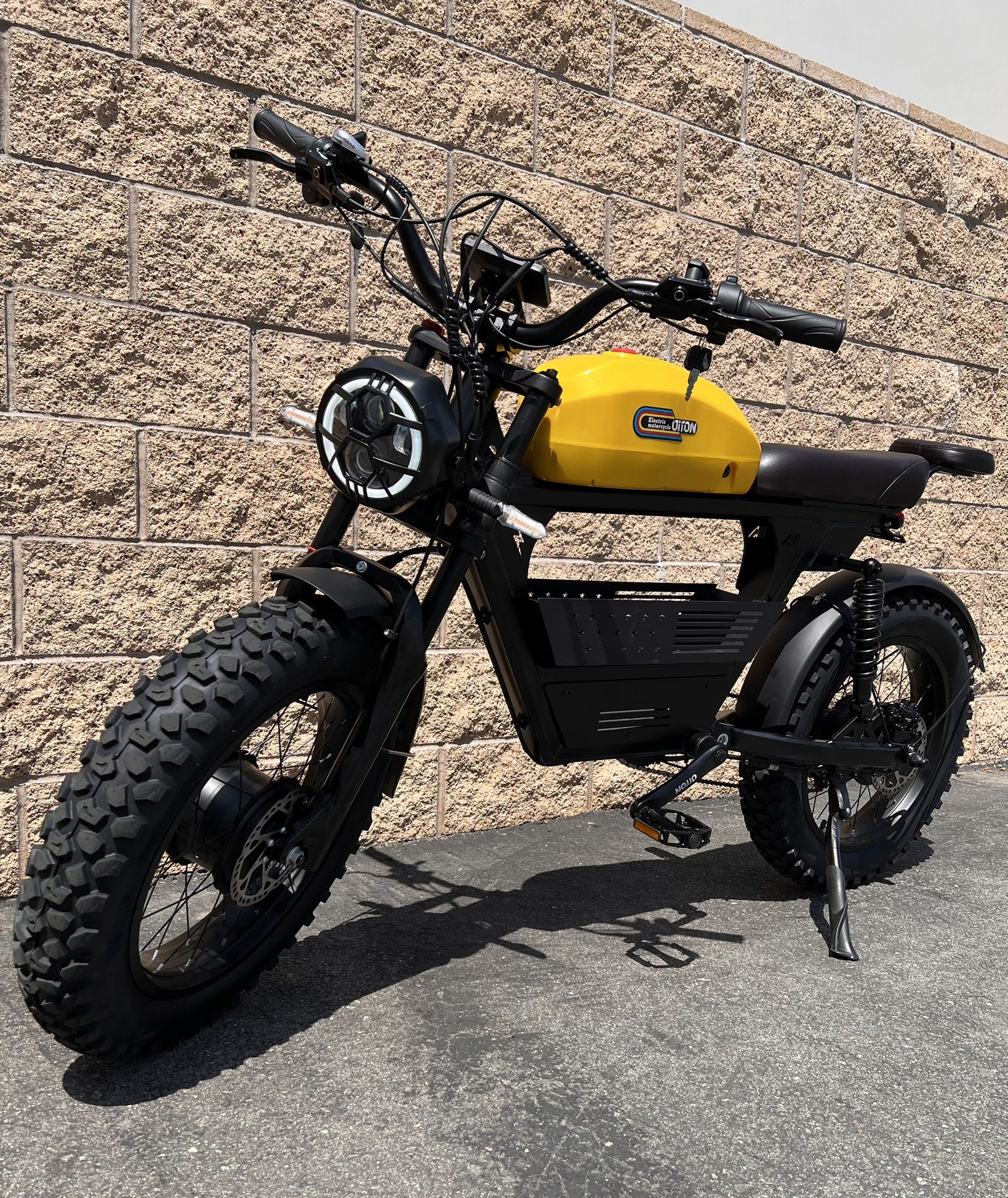 Price includes: Free direct delivery, Taxes included, 1 year warranty, FULL assembly w/ pro tuning, Free test ride before final purchase 3000 Watt Electric E-bike Dual/Twin Motors (1500Watt each) 26ah/48Volt Removable Battery Tank Metal USA Flag Punched Design Center Basket 38MPH Top Speed 25-60+ Mile Range Intelligent Color Display with many options All Wheel Drive, Rear Wheel Drive or Front Wheel Drive Hydraulic Brakes Coffee Can size Custom Headlight Front and Rear Blinkers / Turn Signals Horn Extra Heavy Duty Dirt Bike Thick 20x4.0 Off-Road or On-Road Tires and Rims 31 inch high seat ***Super solid welds literally everywhere on bike, this bike is made to last and ready for just about anything*** Yellow or Blue Tank E-Bike