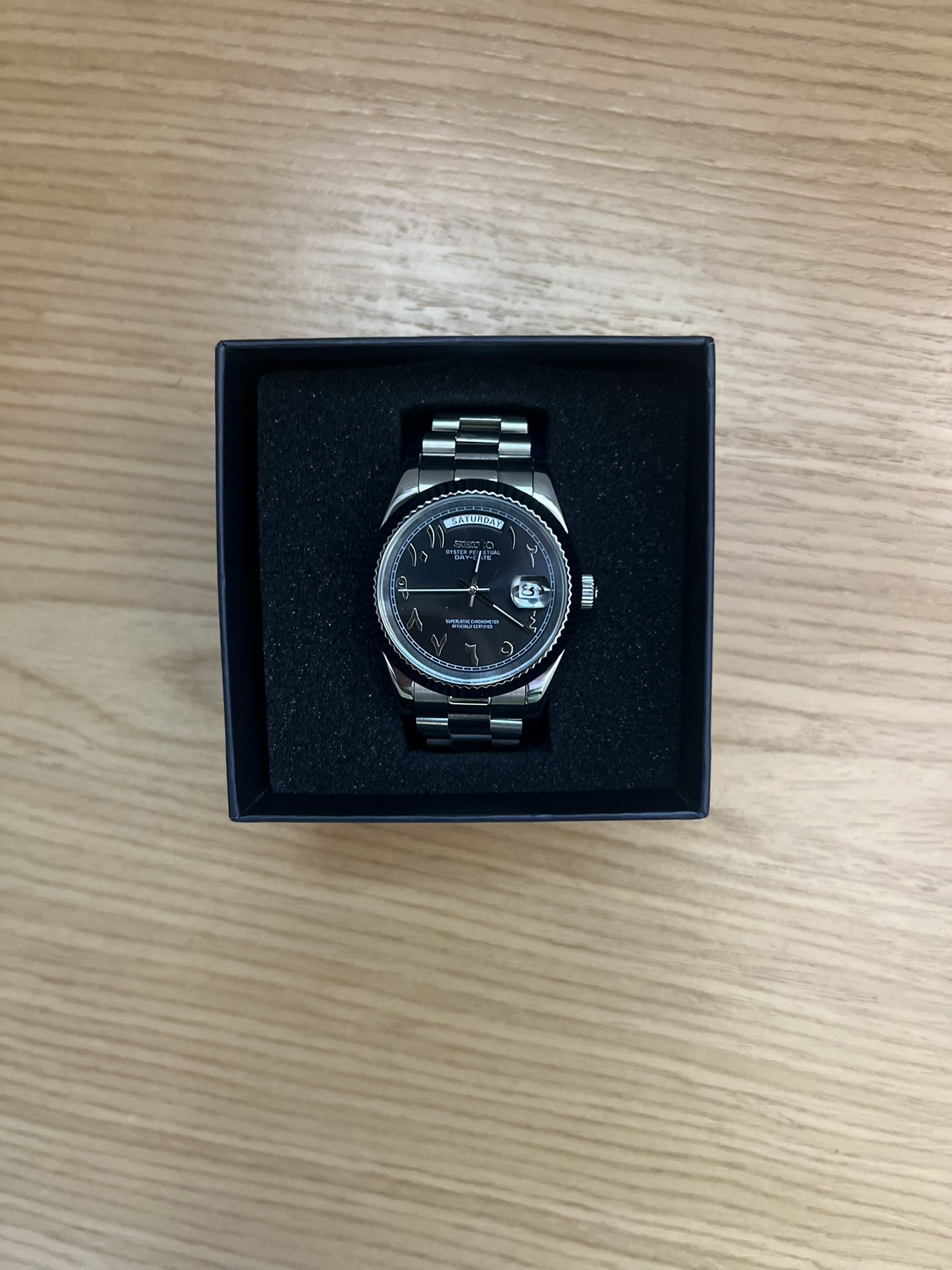 Bold. Minimal. Culturally rich. The Seiko Mod: Day-Date Arabic Black features a matte black dial with elegant Arabic numerals, paired with classic day and date windows for everyday functionality. Powered by the precise Miyota 8285 Japanese automatic movement, this timepiece blends reliable performance with meaningful design. A modern expression of heritage, wrapped in sleek simplicity. ⏳ Premium Features: ✔ Diameter: 40mm (excluding crown) ✔ Movement: Miyota 8285 Japanese automatic (day-date) ✔ Thickness: 12mm ✔ Glass: Sapphire crystal with anti-reflective coating ✔ Dial: Matte black with Arabic numerals and day/date display ✔ Luminous: Luminova on hands ✔ Case: 316L stainless steel in polished/brushed finish or optional black PVD ✔ Crown: Push-pull or screw-down (build dependent) ✔ Bezel: Smooth or fluted options ✔ Bracelet: Oyster or Jubilee-style stainless steel with solid end links ✔ Wrist Size: Adjustable from 14.5cm to 22cm ✔ Lugs: 20mm ✔ Case Back: Transparent or solid steel ✔ Water Resistance: 3 ATM ✔ Functionality: Time, day, and date Where tradition meets precision — a powerful piece for those who wear their roots with pride. DM to order or customize yours. 🖤⌚