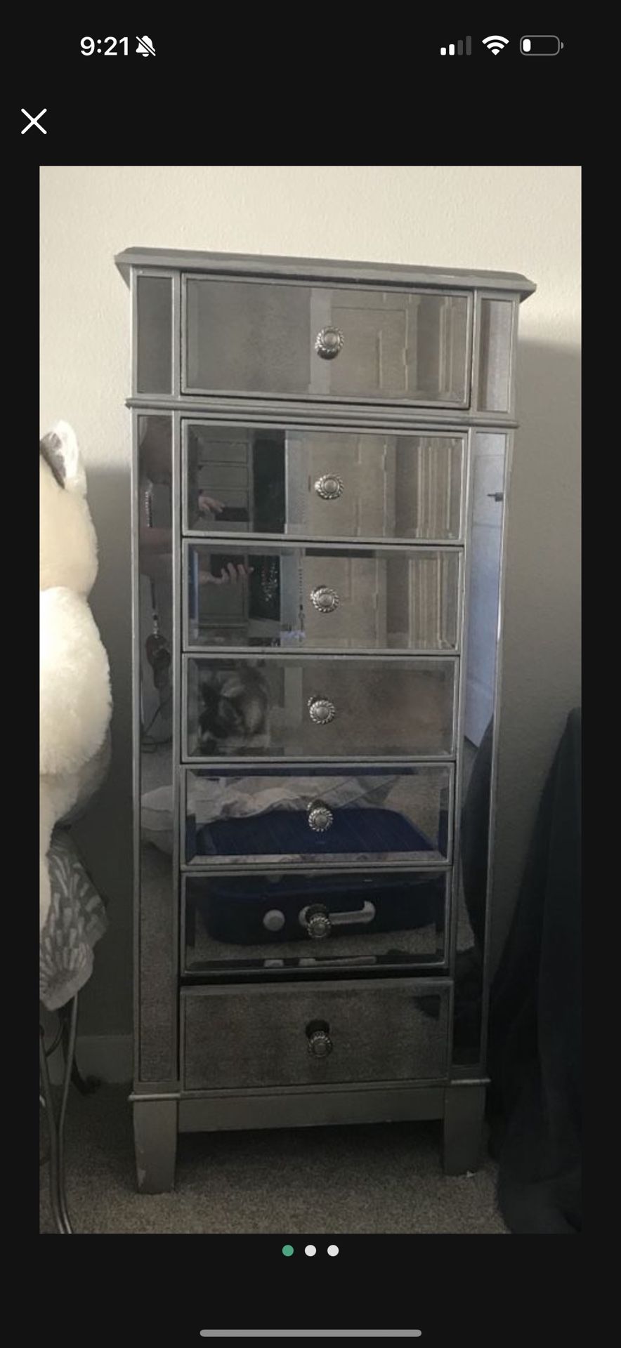 "Mirrored Silver Lingerie Chest" Hayworth brand, Pier1, handcrafted mirror glass Newer, getting a new bedroom set. A few marks (shown in pictures) not noticeable. Shouldn't be much to fix, if needed. 14"x20"x48" 7 Drawers, color: silver