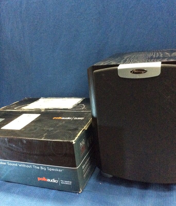 Polk audio 5 speaker set up. Model Black Stone TL250. 1 center, 2 front, and 2 rear speakers. These also come with a Mirage subwoofer. Model OMNI-S8. Both companies produce high quality top on the line audio equipment. These sound great and are a great addition to a home theater room looking for movie theater quality sound. Come check them out in store today.