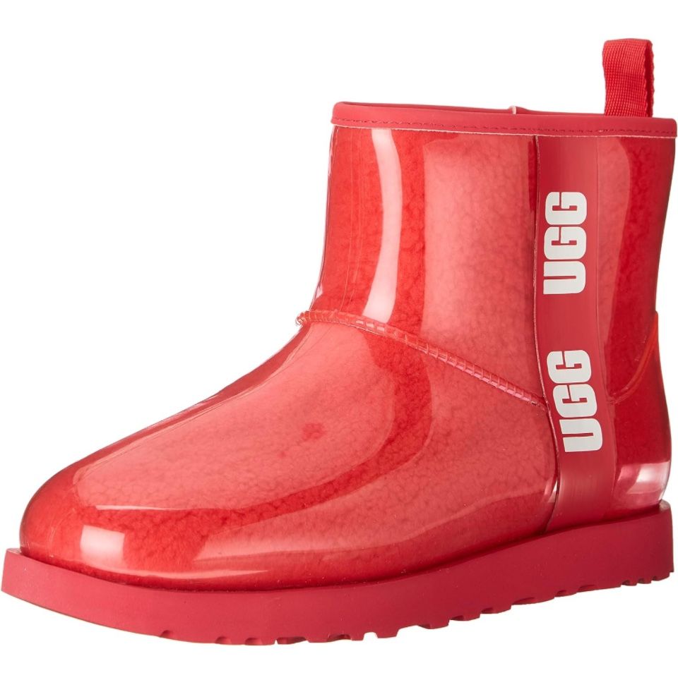 Brand new in box, never worn Color: hibiscus Product details About this item Fabric type 100% Rubber Care instructions Machine Wash Origin Imported Sole material Synthetic Country of Origin Vietnam About this item Curly faux shearling enclosed by TPU molded upper Fully waterproof 7mm UGGplush wool lining and insole Treadlite by UGG outsole for comfort Cold-weather rated to -20˚C Description Warm on the inside and waterproof on the outside, our Classic Clear Mini gives you the best of both worlds and stands out in all levels of downpour. Updating the iconic original, this new waterproof Classic delivers fashion, function, and feel – all in one. Lightweight and weather-rated to temperatures as low as -20 ͦC (that's -4˚F), it's ideal for rainy days in the city, offering coziness you can see with a translucent waterproof upper enclosing curly faux shearling, our signature UGGpure™ wool lining, and a removable UGGpure™ insole.