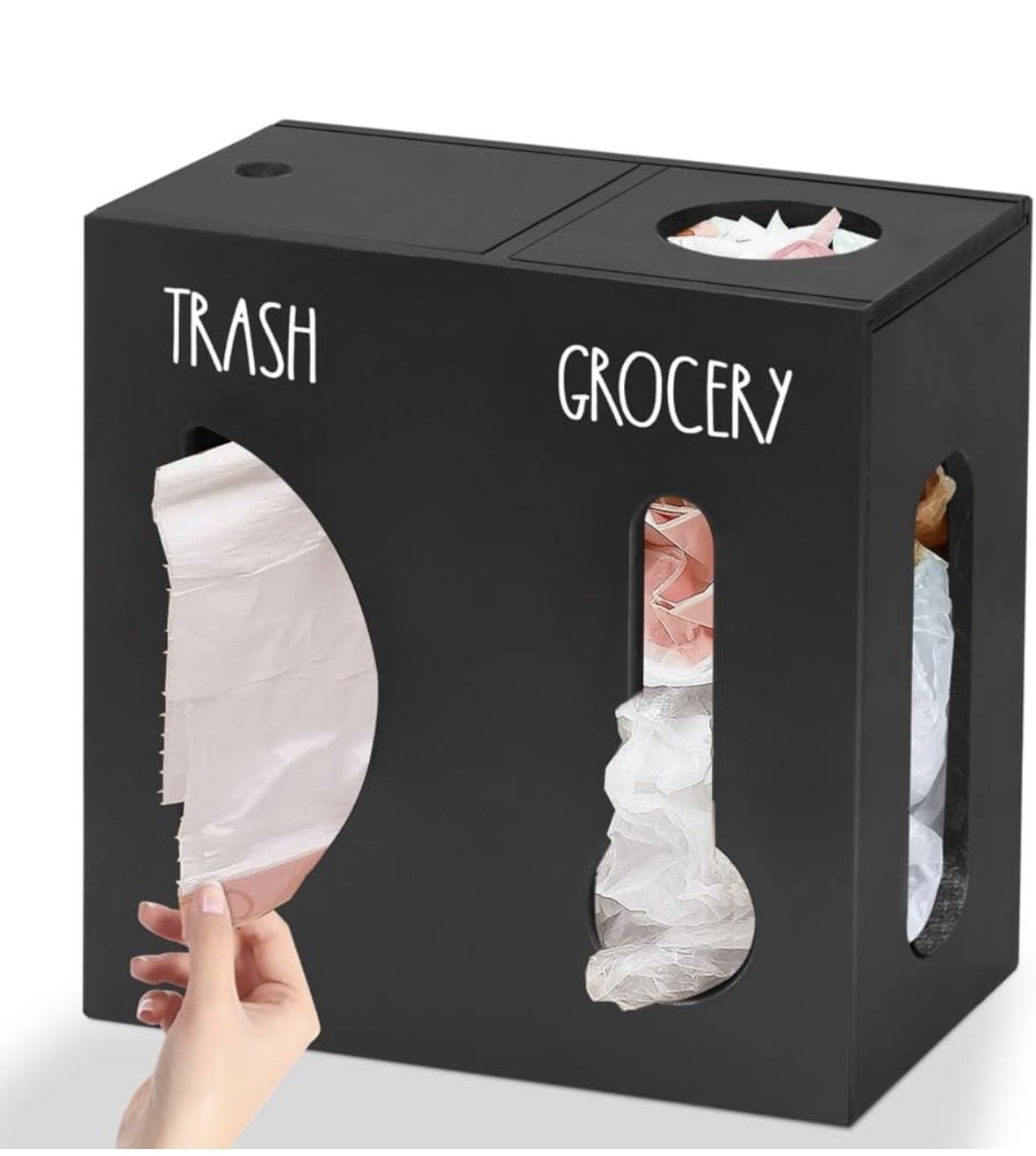 2 in 1 Grocery Bag Holder Trash Bag Dispenser, Wood Trash Bag Holder, Garbage Bag Holder Wall Mount, Grocery Bag Dispenser for Plastic Bags, Kitchen Cabinet Under Sink Organizers and Storage (Black)