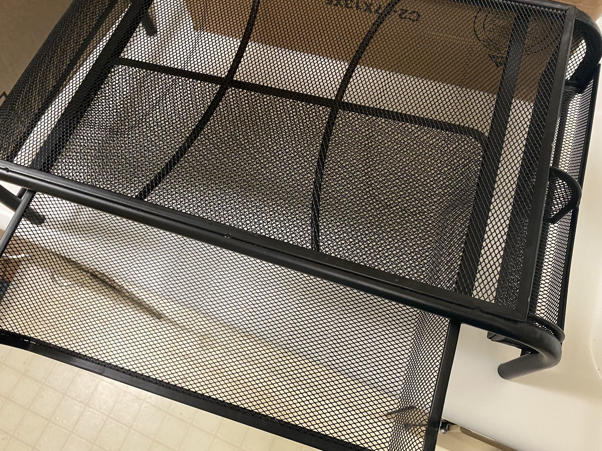 Desk shelf with drawer. Used under printer or computer monitor, for extra space. Drawer slides out. Mini baskets on the side for extra storage