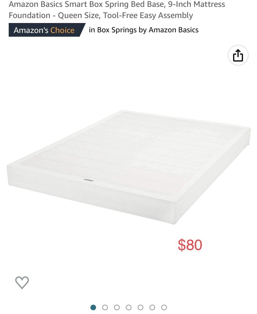 Brand new still in the box Amazon Basics Smart Box Spring Bed Base, 9-Inch Mattress Foundation - Queen Size, Tool-Free Easy Assembly We are selling for $80 Be sure to LIKE/SHARE/FOLLOW our discount shop Facebook page @ Make An Offer RI and my personal Commerce Page! Message us to set up an appointment!