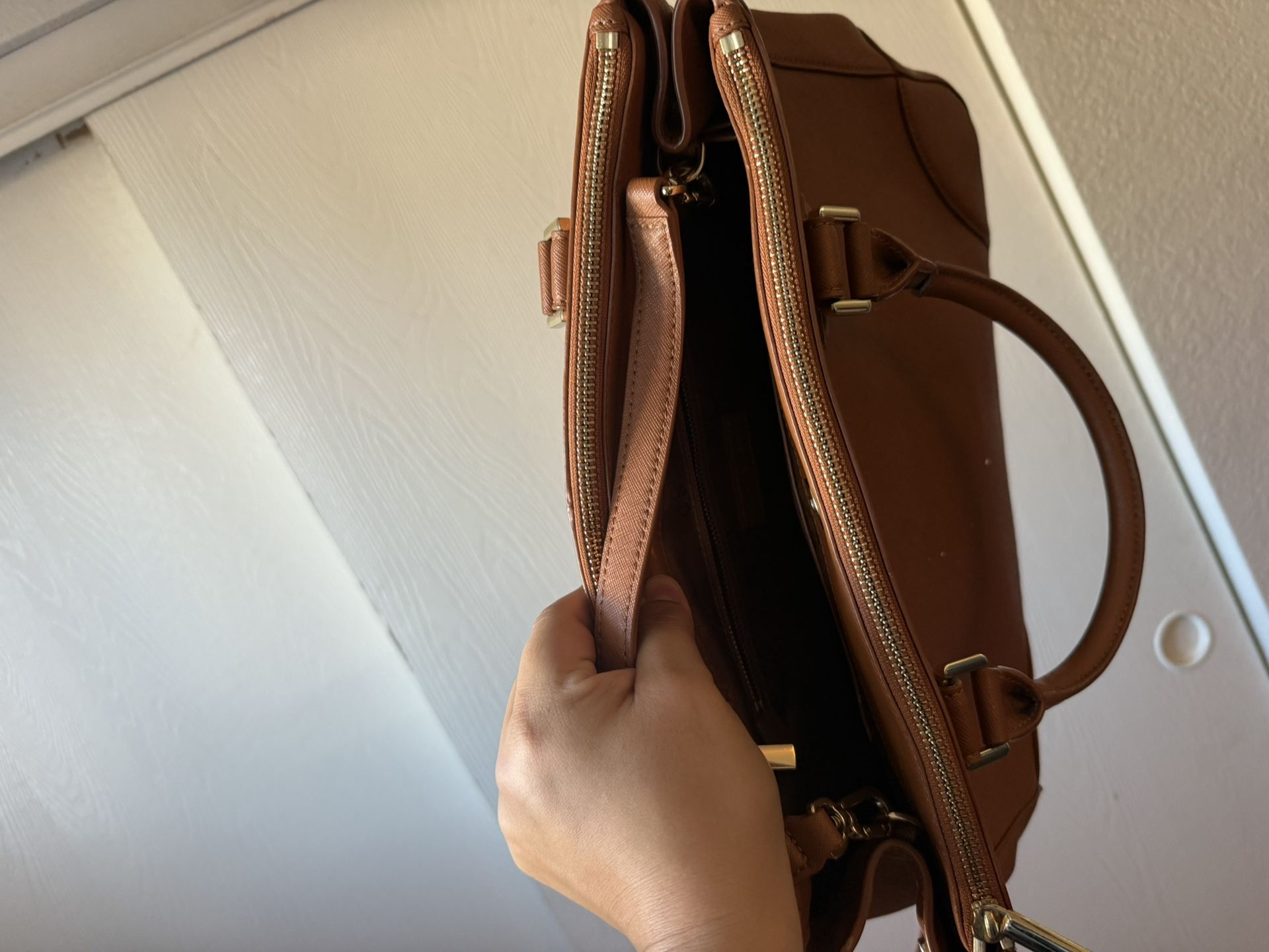 Large used brown Tory burch purse one of the smaller handles snapped but it come with a cross body strap as well. Lots of storage. See pictures for details.