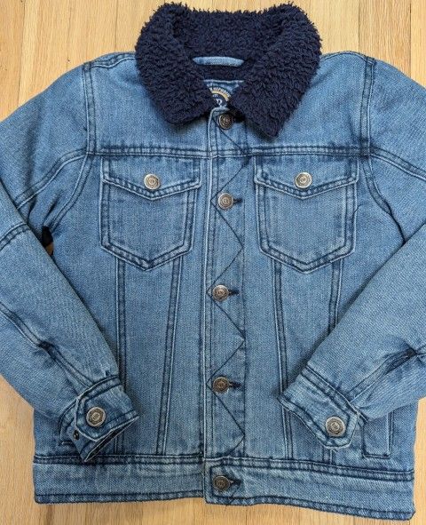 This cool denim jacket is accented with faux fur point collar. Point collar Long sleeves Snap cuffs Button front Chest flap pockets Waist slip pockets Faux fur polyester lining Cotton Fur type: Faux Machine wash