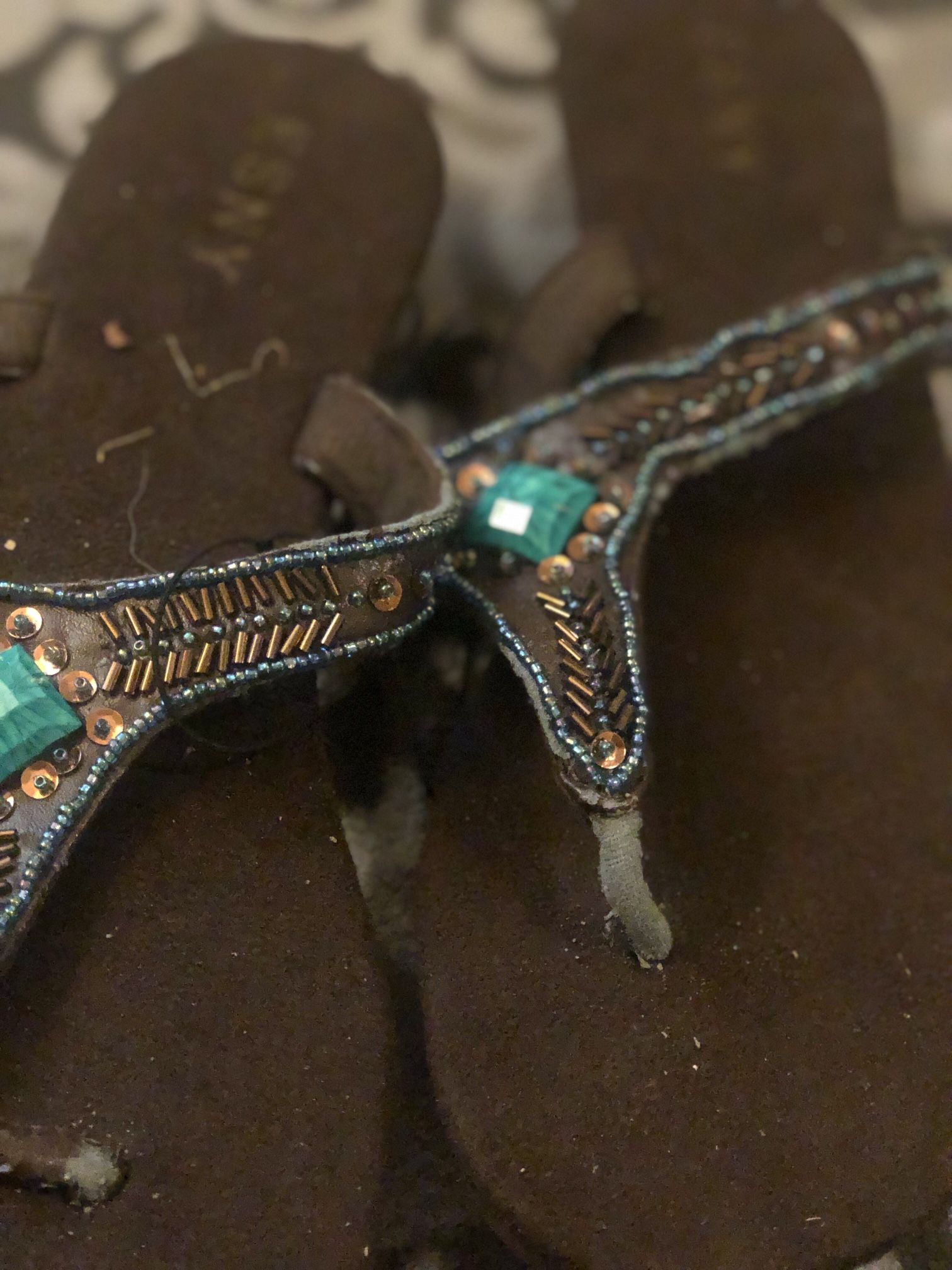 Turquoise and brown jeweled sandals small wedge. Buy today. Size 8.8M