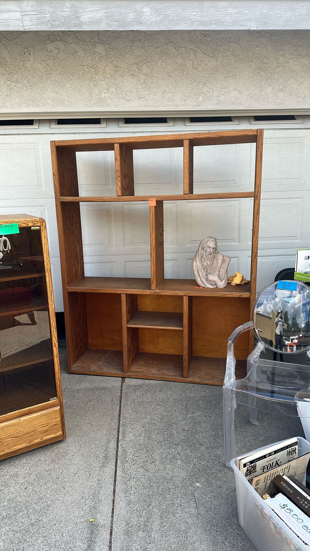 58” wide, 16.5” deep, 6-feet (72”) tall , solid oak. Heavy! 90s chunky wood, great for record storage or as a bookshelf.