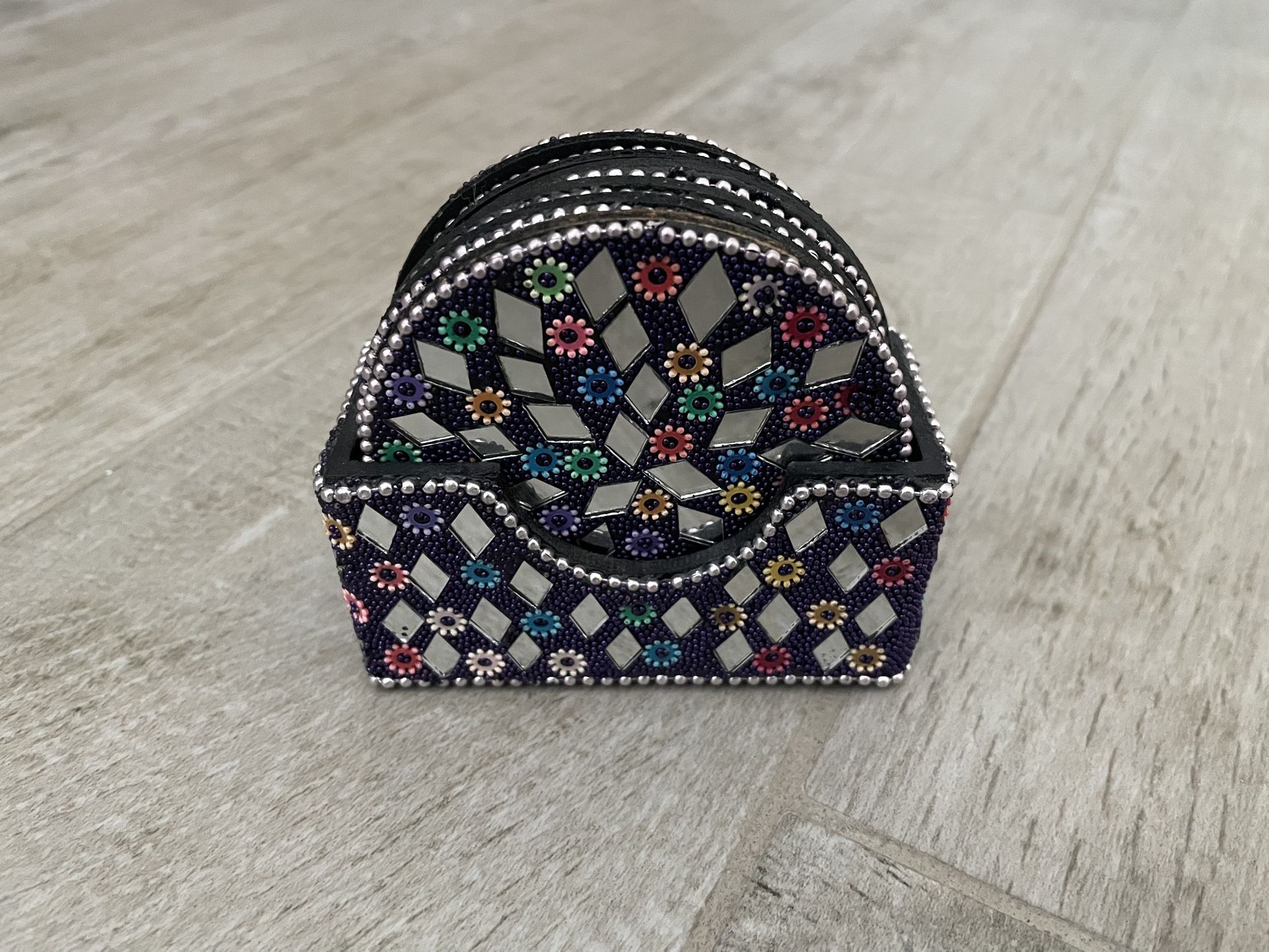 Tea Coaster Set with Holder - Traditional Indian Style with Mirror Work - Purple Brand new