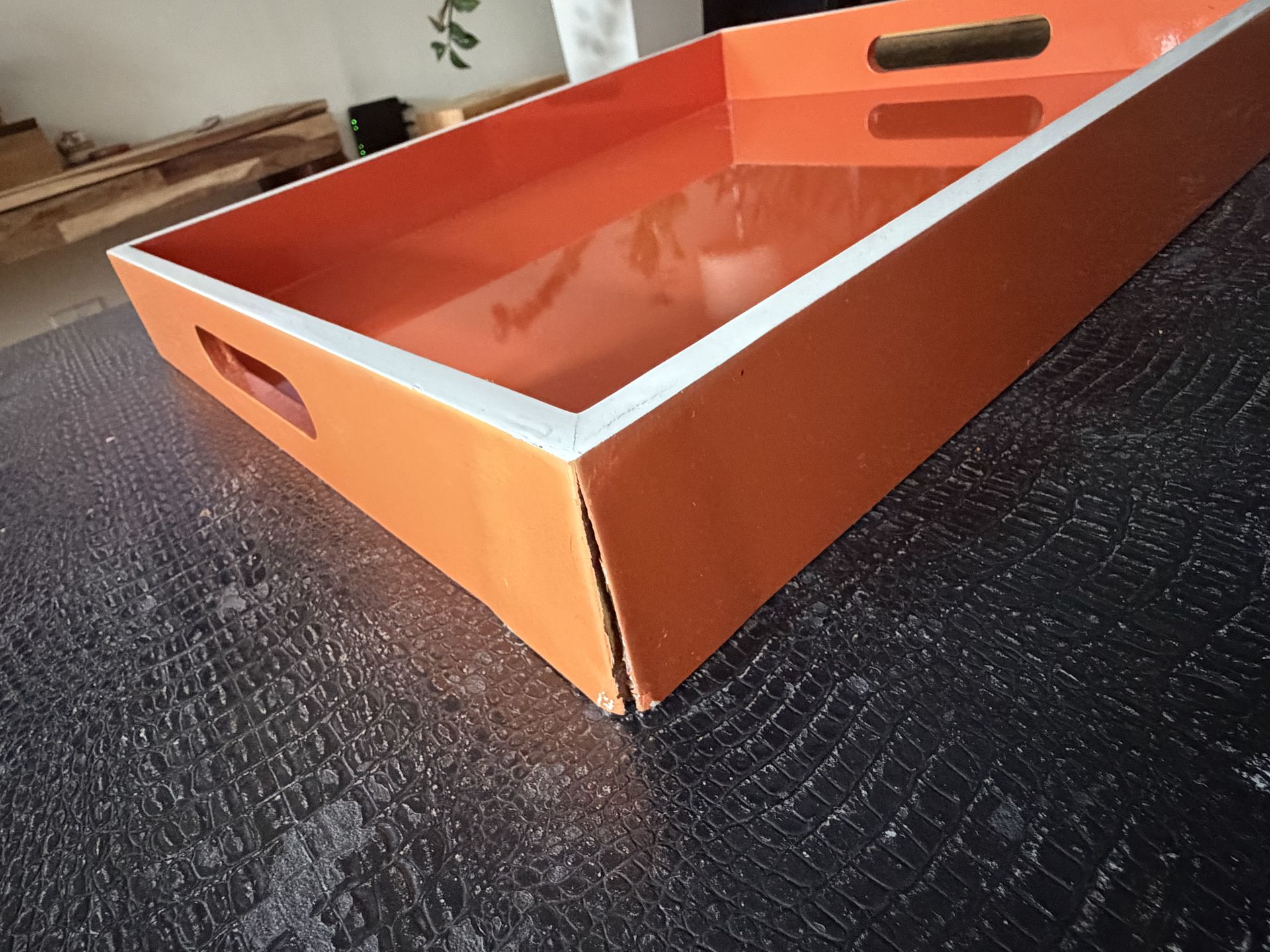 West Elm decorative serving tray Modern lacquered tray in orange with white trim. Minor cosmetic damage on one corner (see photo), does not affect functionality. Great for coffee table styling or entertaining. Retail originally over $60. Pickup in Battery Park.
