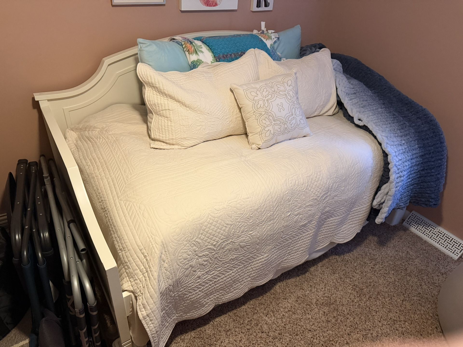 This daybed has never actually been slept in! I bought it for my smaller guest room, but our guests have all preferred an air mattress that sleeps two. It’s a pretty, off-white bed by Better Homes & Garden. Sized 22” tall in the front (frame only) and approximately 37” tall in the back. There are some minor scuffs to the edge of the bed, where foot traffic would be. It’s 42” wide and about 79” long. The price in the listing reflects the bed only. The mattress can be added for $25 and the bedding also for $25. ($50 for both) The bedding is a Madison Park Venice Cream Scalloped Edge Daybed Cover Set from Bed, Bath, & Beyond (online store) and retails currently for $70. I have the quilt, bedskirt, square decorative pillow, and two standard shams. The remaining pillows/bedding in the photo will not be included. The mattress was ordered online at one point but I cannot find the original listing to provide more detail there. If more photos are requested to see condition, happy to include them. Everything is clean and comes from a smoke-free home. Not even a pet has sat on this bed. Local pick-up and cash only. Local pickup only — buyer must bring help to move/load if needed.
