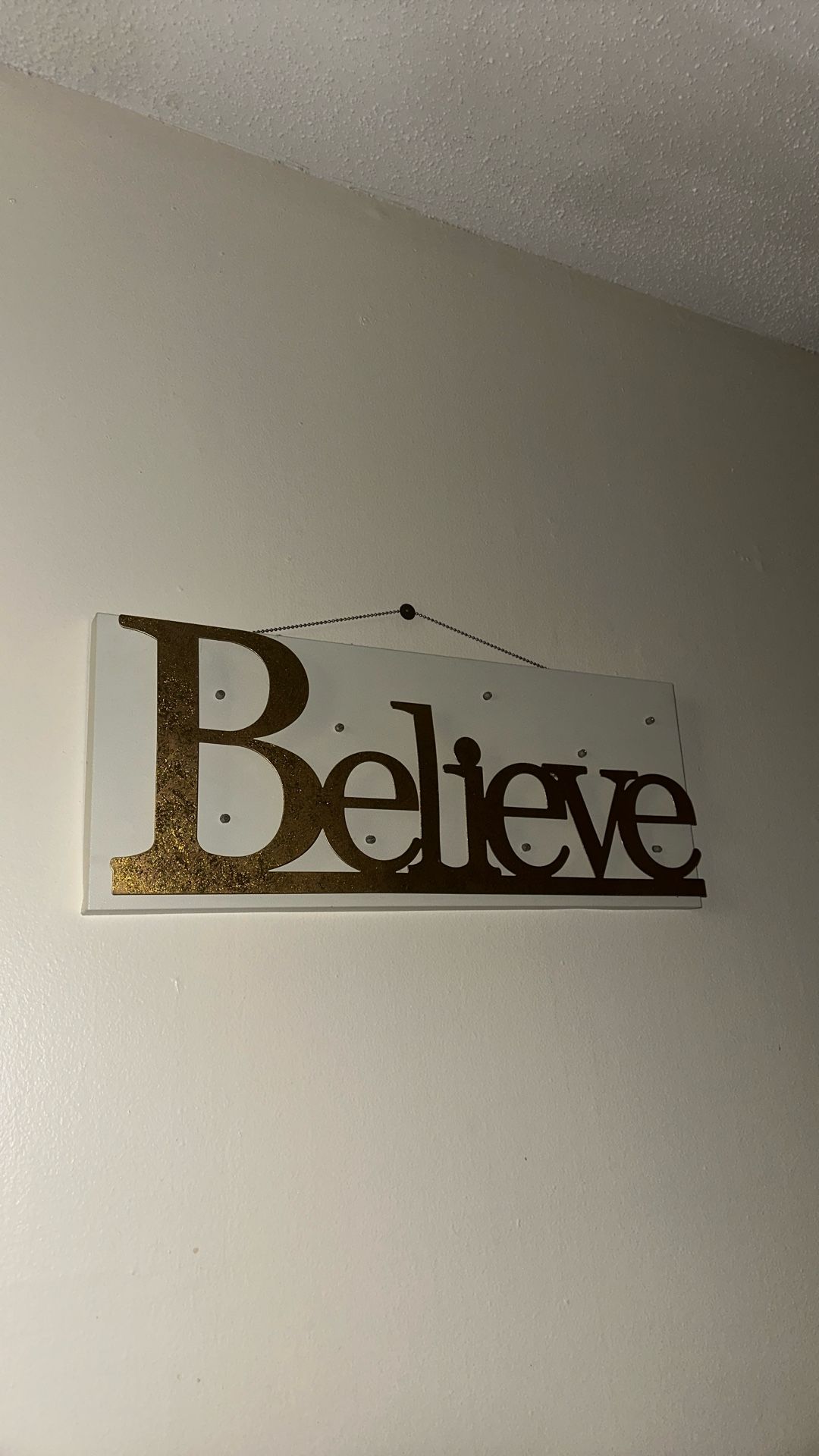 Beautiful light-up “Believe” wall art that adds a warm, cozy glow to any room. Gold metallic lettering on a white base. Works great and lights up evenly. Perfect for bedrooms, living rooms, hallways, or as holiday décor.