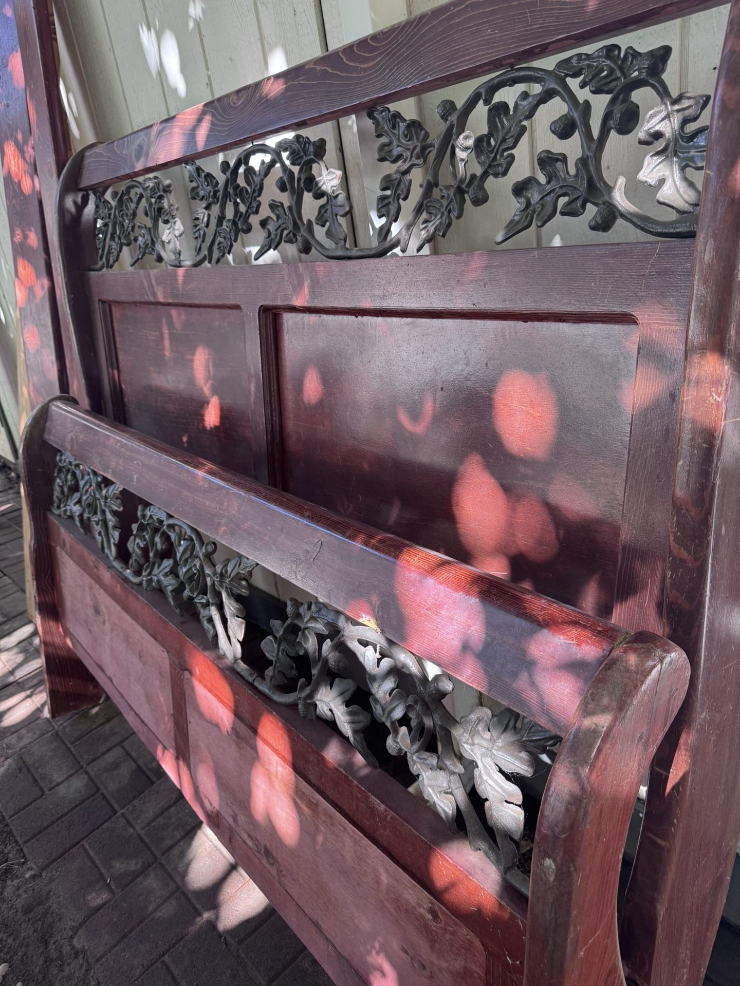 Solid wood hand made bed frame. Dark cherry stain. Oak leaf iron detail on headboard and footboard. Total sale includes headboard, footboard, side rails, and wooden slats for center stability.