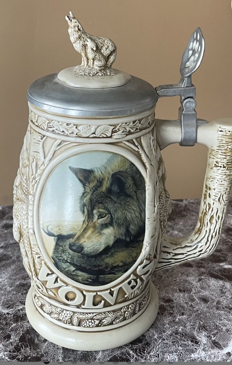 Wolf Beer Stein- Avon Ceramic Collectable Tribute to the North American Wolf handcrafted made in Brazil for Avon. 1997 Numbered.