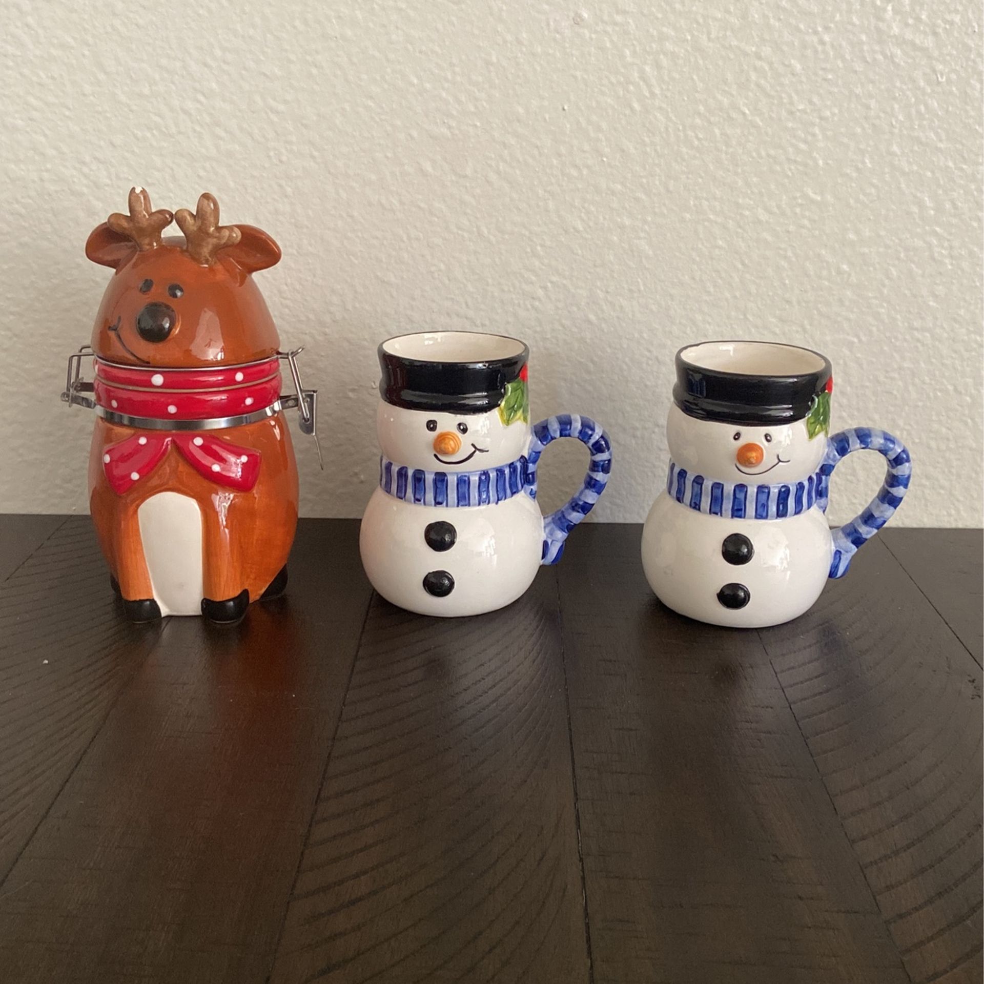 This trio is great to leave out milk and cookies for Santa on Christmas Eve or just to enjoy hot chocolate and peppermint park on a random evening in winter. There are two mugs standing 5” tall and hold 16 ounces each. And the cookie jar is 4 1/2” tall from the neck down, and 8” tall with the lid closed.