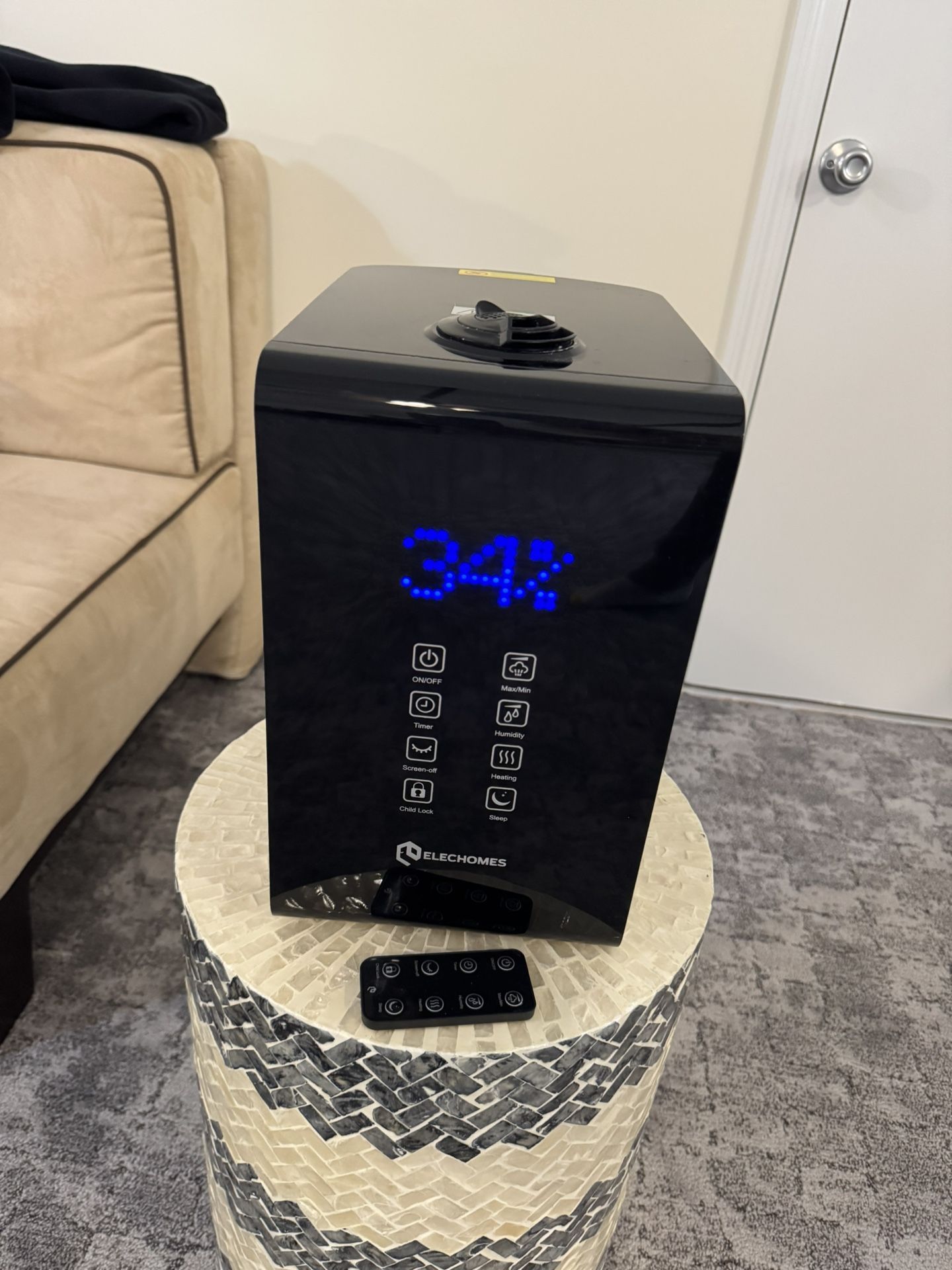 A 5.5L/1.45Gal humidifer by Elechomes for large rooms. Cool & Warm mist. Top fill vaporizer with remote control and a cleaning brush. Very quite, LED display, humidity sensor and auto shut-off. Color: Black Water tank size: 5.5 liter Measurements: 10.4”W, 7.2”D, 12”H Room coverage: 755sq ft / 70sq mt Filter model: SH8820