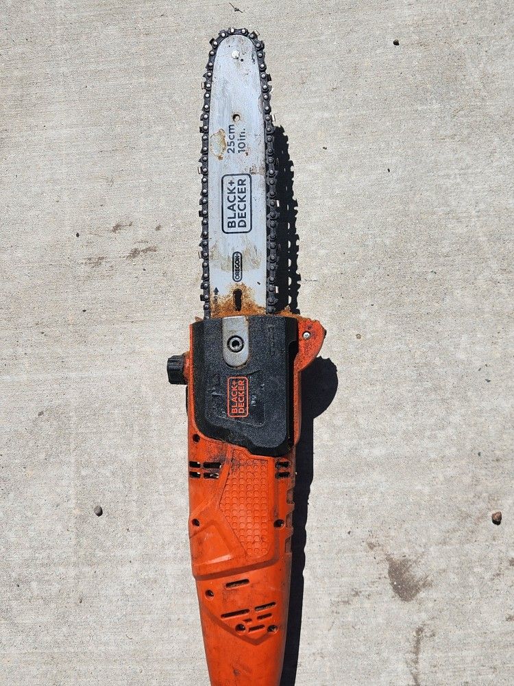 The BLACK+DECKER PP610 Pole saw is ideal for cutting for high hanging branches. This saw features a 6.5 Amp powerful motor for demanding cuts. A 10 in. Oregon low-kickback bar and chain allows for improved cutting performance. Sturdy 9.5 ft. extended pole for hard to reach branches Automatic oiling system ensures constant bar and chain lubrication Inline motor for direct pruning and clear line of sight Clear oil window for easy to gauge oil level