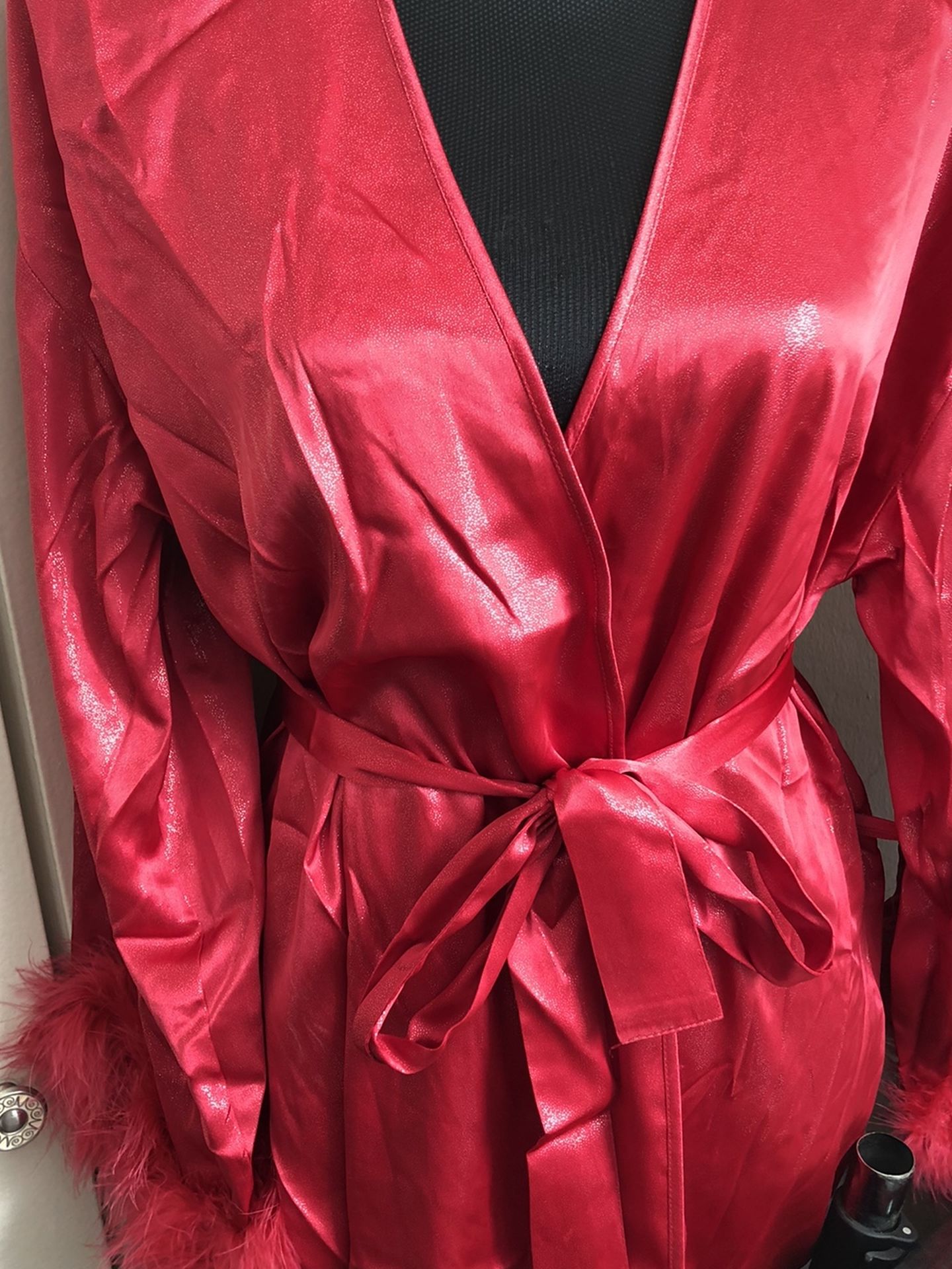 Glitter like fabric with feathers. Belt and pockets. Matching nighty available for $3 Size S