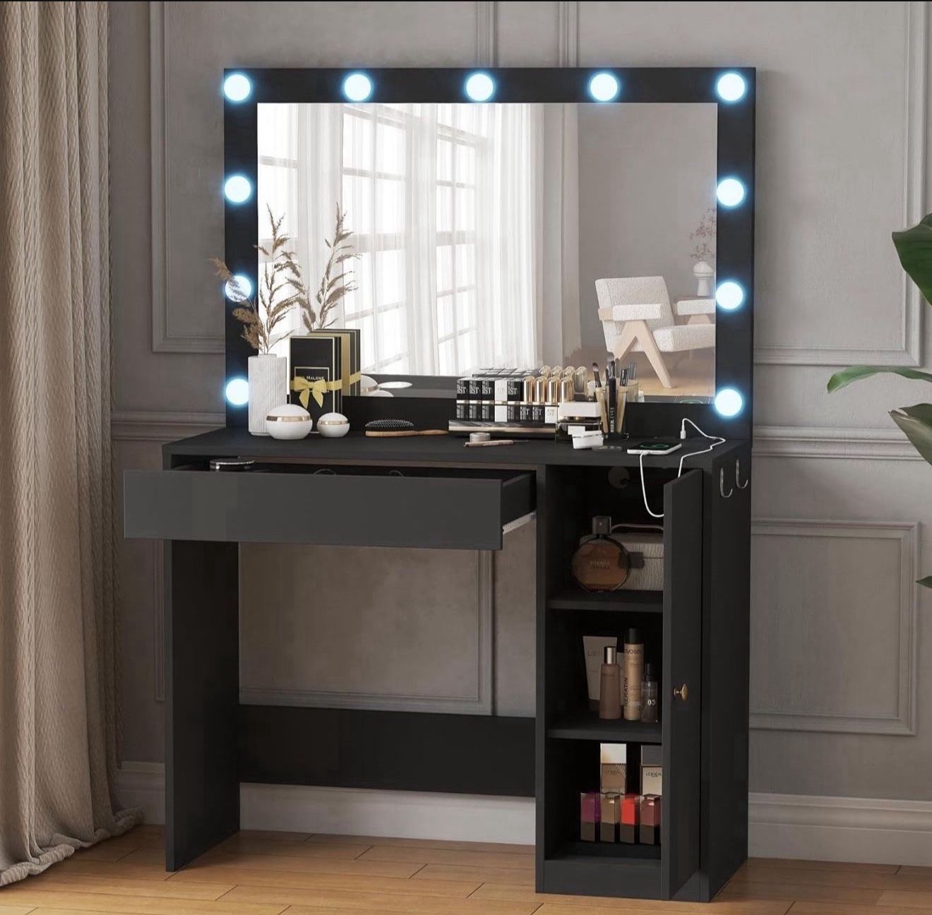 Modern Black Makeup Vanity with Lighted Mirror & Cabinet Storage