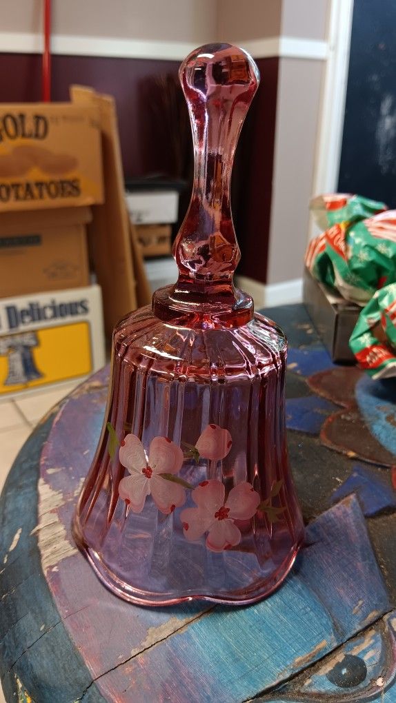 Vintage FENTON GLASS PINK BELL SIGNED By ? HANDPAINTED FLOWERS