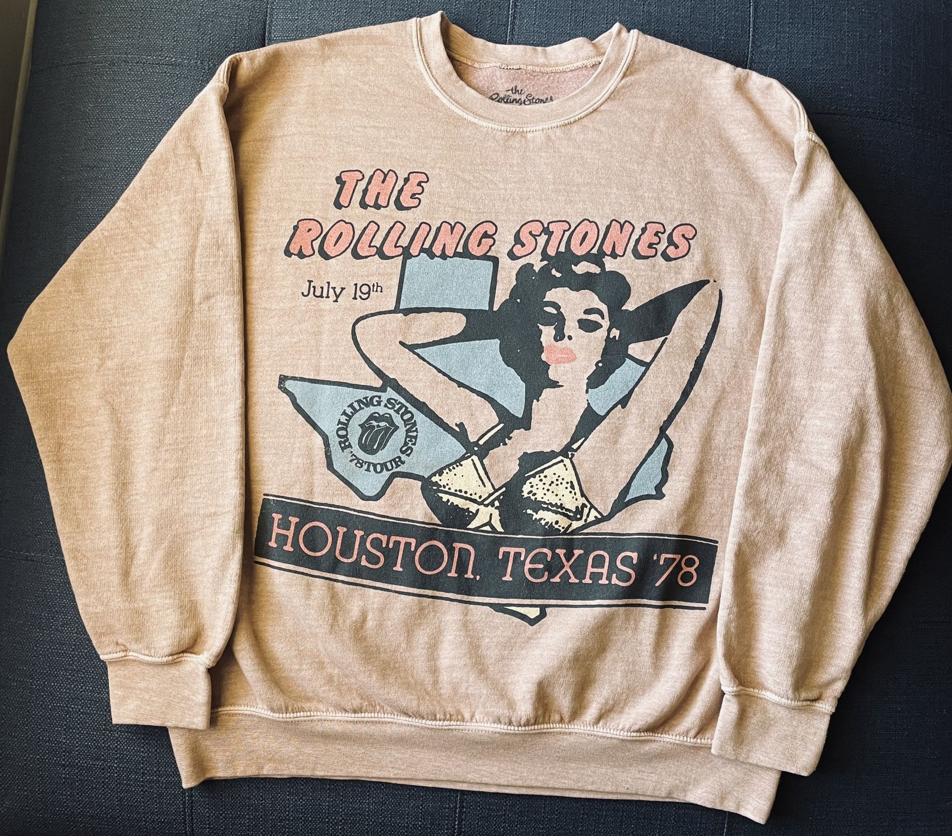 Rolling Stones 1978 Some Girls tour sweatshirt in EUC. Essential Rolling Stones graphic sweatshirt with bold vintage-inspired prints at the front and back. Cotton poly blend fabrication in ‘Taupe’, with a garment dyed wash effect. Standard fit with a crew neck and finished with ribbed knit trims. Features - Rolling Stones Houston 1978 graphic crew neck sweatshirt - Crew neckline - Bold front & back graphics - Garment dyed wash effect - Ribbed knit trims - Regular fit Content + Care - 50% Cotton, 50% polyester - Machine wash cold with like colors - Imported