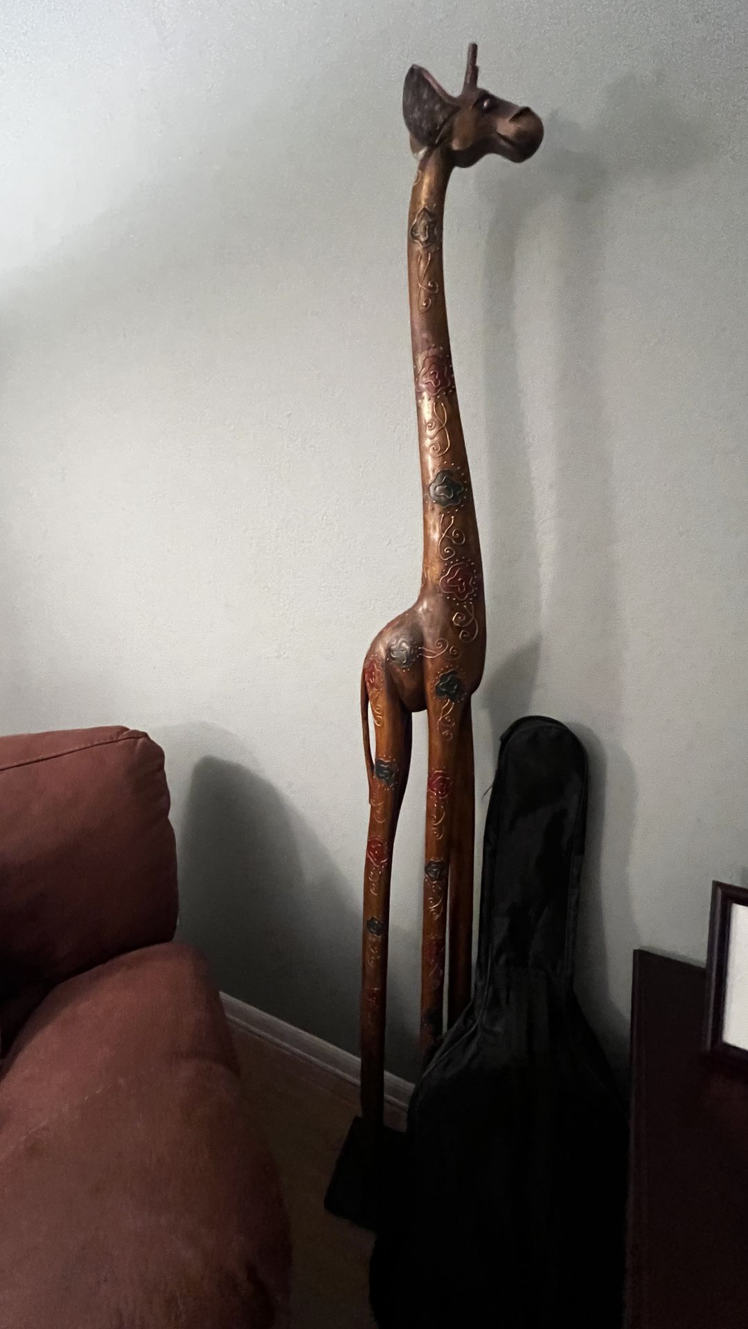 This hand-carved wooden giraffe stands tall with a graceful, elongated neck and gently curved posture. The natural wood grain flows along its body, giving it warmth and character — each line in the grain like a fingerprint of the tree it once was. Its slender legs are carefully shaped, balanced with quiet strength, and the subtle detailing around the face and ears adds personality without overwhelming its simplicity.
