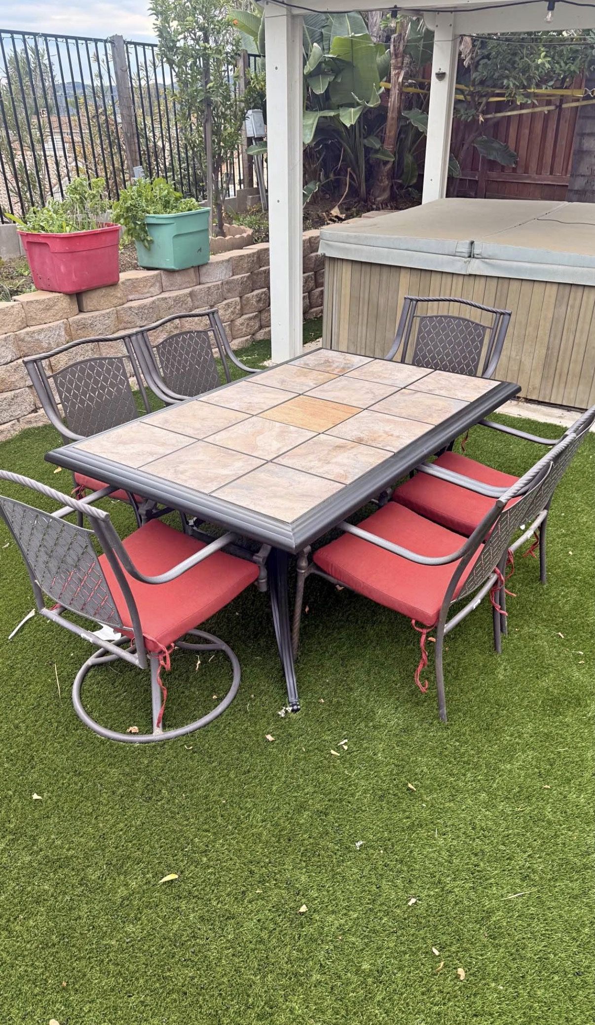 outdoor tile patio dining set with 6 cushions, 2 swivel captains chairs and 4 standing middle tile is extra can be taken off and had an umbrella hole Table is 5 by 3 pick up temecula by the mall delivery available for extra after purchase