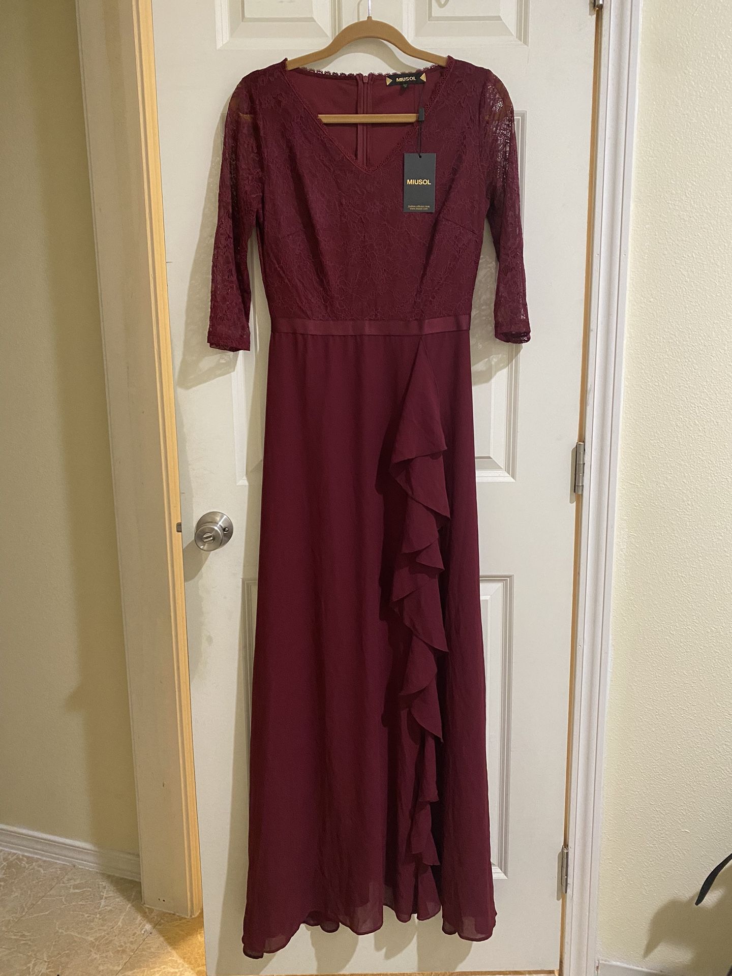 This is a very pretty gown in wine color. Medium size or size 4 still with tag.