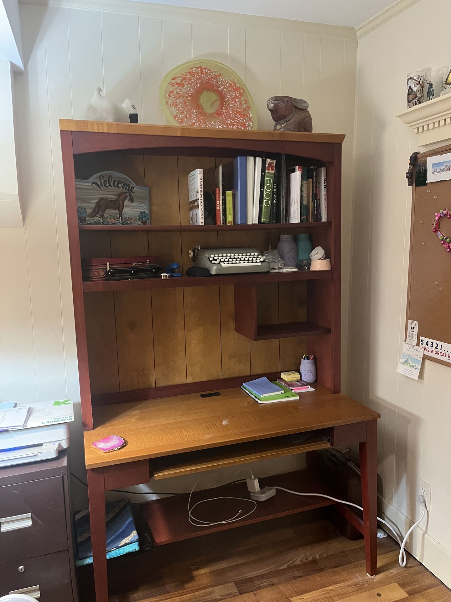 Solid cherry wood, Ethan Allen desk with built-in hutch. High-quality, and sturdy. Some mild cosmetic wear on the desktop finish (see photos), but no structural issues. Beautiful traditional piece with lots of storage buyer must pick up located in Boston.