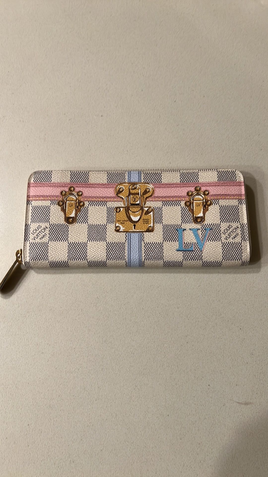 Authentic LV Damier Azur Summer Trunks Clemence wallet 2018 Limited Edition- Gold-color hardware - Rose Ballerine interior Heat stamp “Made in Spain” date code CA0188 8 card slots - 2 flat pockets - 2 large gusseted compartments - 1 zipped coin pocket 7.7inx3.5inx0.6in Preowned & in excellent condition - only minor marks along zipper closure pictured. I haven’t tried to remove them so I’m unsure whether they’ll remove w/cleaning or not. Both zippers run smooth/no issues/no tarnish - outside zipper bright & shiny w/slight surface scratches - inside zipper good condition just dull Canvas in excellent condition no scuffs/rubs- Corners in excellent condition, all stitchings intact, spine of wallet is strong but slightly discolored from use- cleaning would remove those dirty spots - just dirt from usage. Inside in exceptional condition- very clean & no spots/stains Card slots are clean w/no stains and the coin pocket has no stains/marks. Please don’t hesitate to ask me any questions!!
