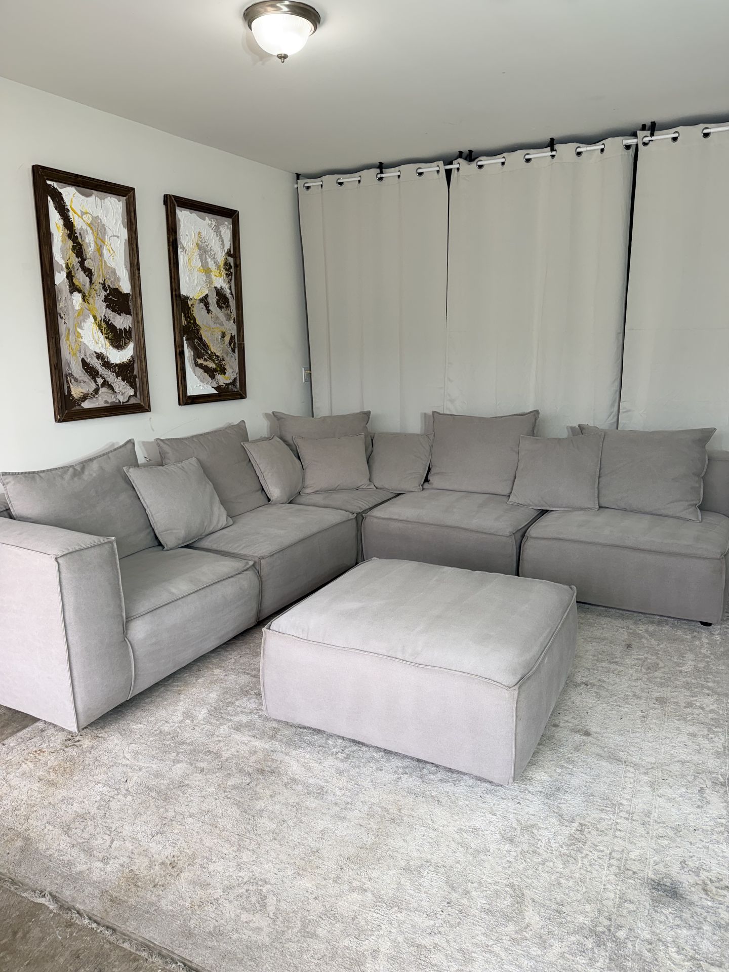 🛻Delivery Available🛻 How to get the first dibs on future sectionals/couches and get extra perks. ⬇️Join the Facebook Group ⬇️ 🛋️(Gently used couches in Nashville)🛋️ Arhaus Coburn 6 piece sectional Pet friendly , smoke free No tears, some stains Really comfortable 40”x40 corner pieces (2 pcs) 36”x40” armless pieces (3 pcs) 38”x38” ottoman (1 pc) 29” back height 16” cushion height First come first serve, I will not hold or mark as pending unless with a deposit.