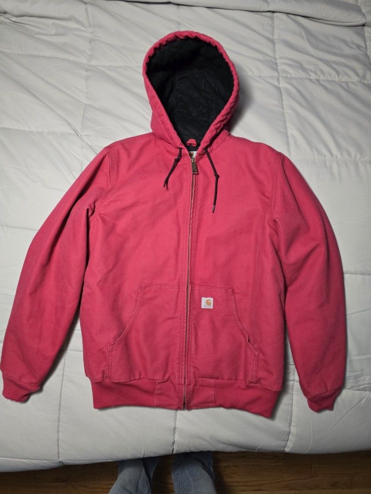 Vintage Women's WJ130 624 Size-Medium 8/10 Red Carhartt hooded bomber jacket. It was only worn a few times when first purchased. It's still like new, and it still has the "Carhartt stiffness" to it. It has not been broken in yet due to it always hanging in the closet. I bought it for my wife many years ago, and she only wore it a few times. She just doesn't like it. Must see to appreciate. Serious inquiries only, Please.