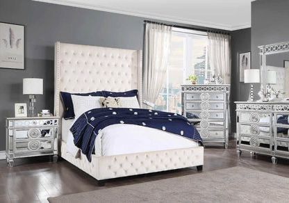 Stunning Beige Velvet 84” Tall Button-tufted Bed with a Wingback Design Queen: $2,299 King: $2,399 Includes: Nightstand Dresser Dresser Mirror Add Chest: $899 Best Prices in the Industry Guaranteed! (Mattress Not Included) *No Tax *Pickup in Tracy by Appt *We Can Deliver